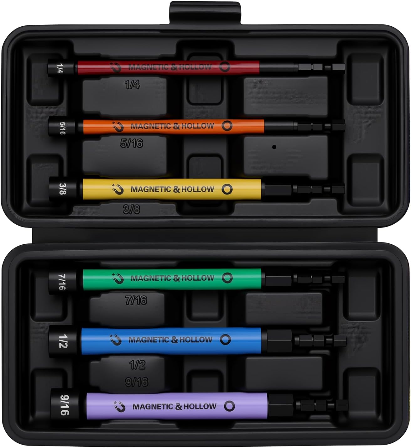 Hollow Shaft Design for Extended Reach: Tackle long bolts and threaded rods with ease. Featuring a 5-inch extended reach and a deep hollow core (3.35-inch depth), this nut driver set allows you to work on protruding bolts in tight spaces like under hoods or inside HVAC units without any obstruction. Color-Coded Sizes for Quick ID: Save time on every project. The set features color-coded bands for instant size recognition, SAE hex sizes: 1/4", 5/16", 3/8", 7/16", 1/2", and 9/16".