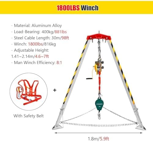 Emergency Life Saving Equipment:This confined space entry kit is expertly crafted for safe access and fall protection in challenging environments such as wells, sewers, and tunnels. Constructed from durable iron and alloy, this kit supports a significant load capacity, providing peace of mind during operations in restricted spaces. Due to shipping logistics, the product is delivered in two separate packages. Featuring premium aluminum alloy material, this kit boasts a man winch efficiency of 8:1 and an adjustable height range of 1.41 to 2.14 meters (4.6 to 7 feet). It offers three winch options—1200LBS, 1800LBS, and 2600LBS—each engineered with a safety factor of 10. The hand-operated handle force is designed to remain at or below 500N, ensuring user comfort and safety. Detailed specifications for load-bearing capacities and steel cable lengths for each winch type allow you to choose the perfect model for your specific application. Key advantages of this kit include its impressive load capacity, adjustable tripod legs that provide versatility from 4.6 to 7 feet, and user-friendly disassembly and installation for effortless transport. The retractable tripod allows for seamless height adjustments, enhanced by a self-locking winch and an anti-dropping device that prioritizes safety. This kit is ideal for confined space work in various settings, including wells, sewers, and underground pipes, with adjustable feet for stable installation in uneven conditions. Included in the package are a confined space tripod kit and a safety belt, making it a comprehensive solution for fall protection. Please be aware that product dimensions are subject to manual measurement and may vary by 1-3cm. Additionally, slight color variations may occur due to lighting and screen differences, so the actual product color may differ from the images shown.