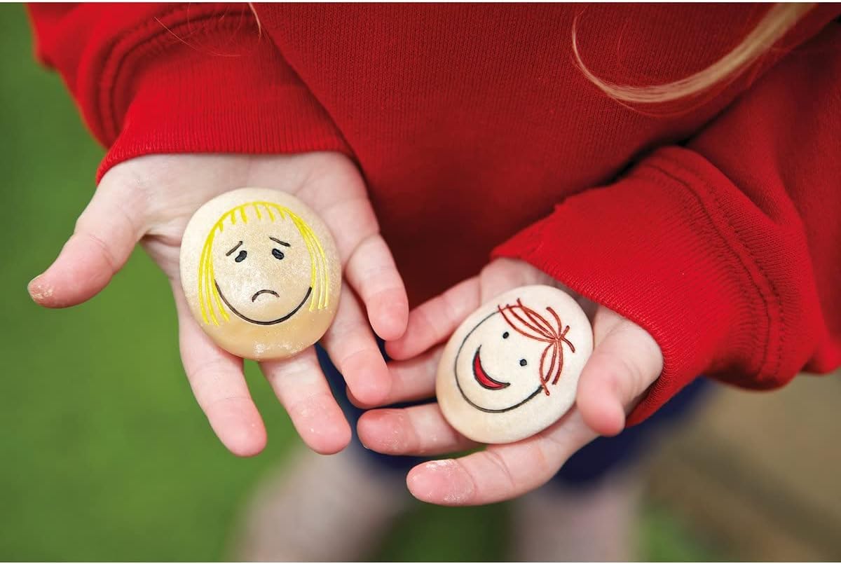 Beautifully crafted from a durable mix including real stone, these tactile stones will support children in identifying facial expressions and emotions and will help them to communicate how they are feeling and to understand the feelings others. Set includes 12 stones measuring 2 x 1.5 inches: happy; sad; angry; surprised; frightened; worried; proud; confused; calm; bored; shy; embarrassed. Length: 5.1. Width: 3. Height: 3