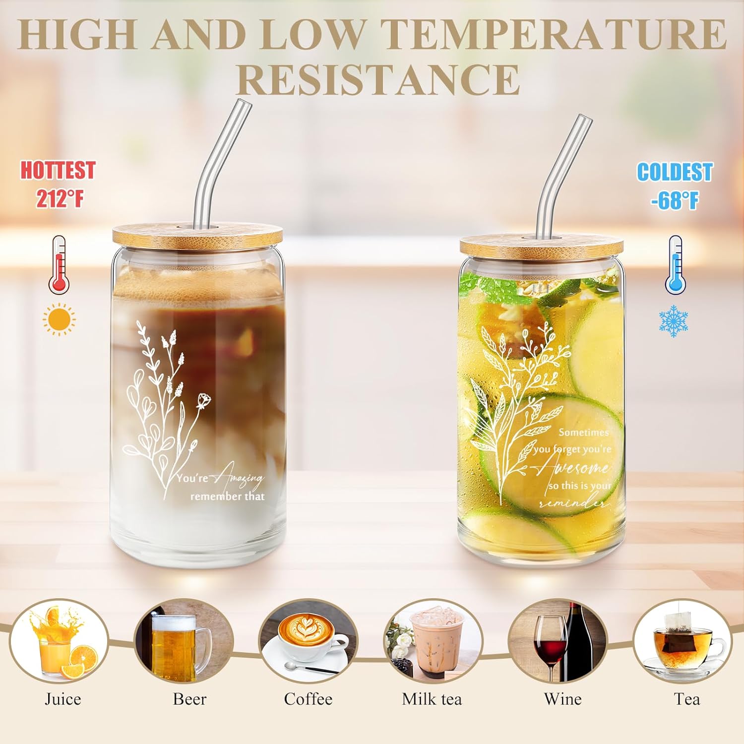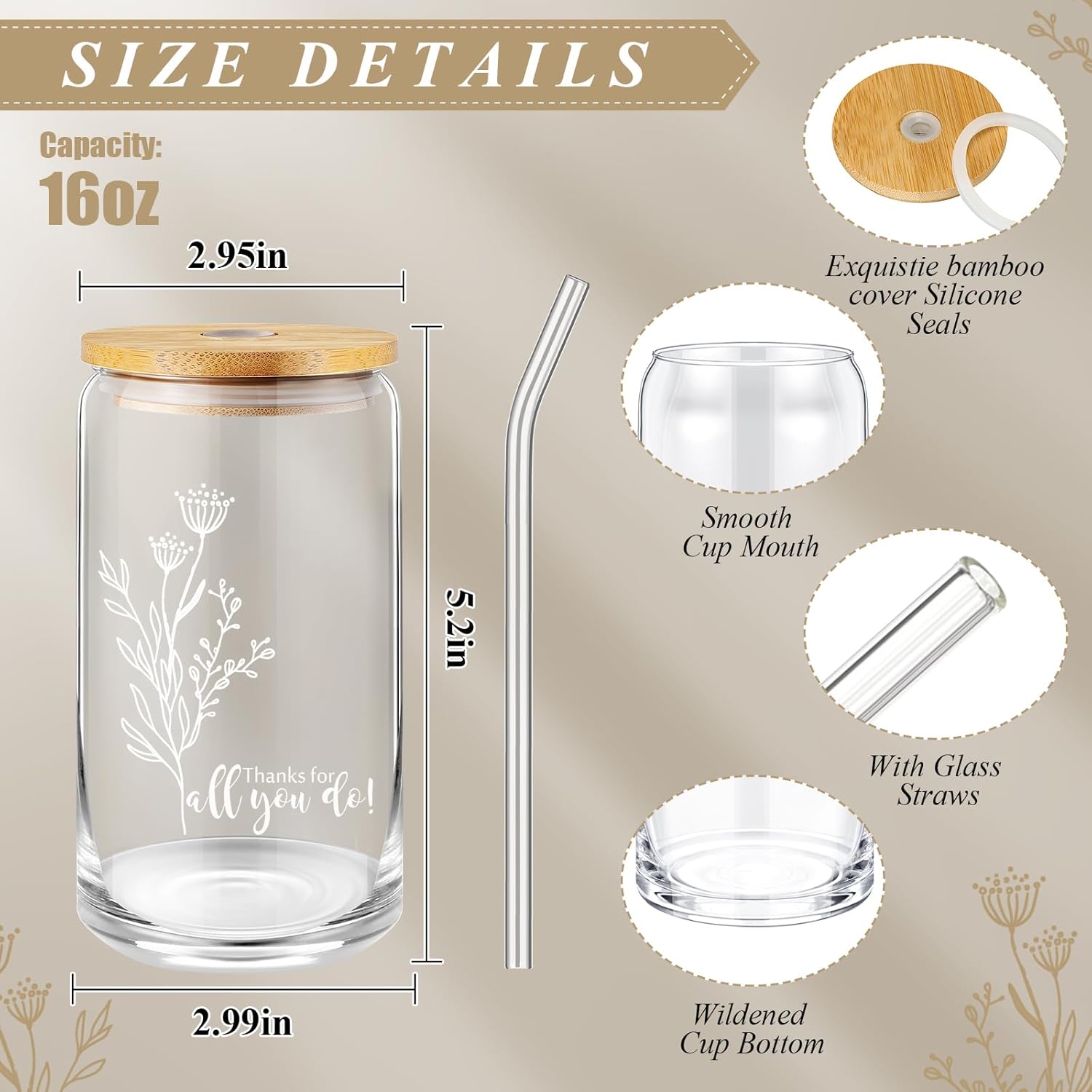 Features: Thank you gift: The flower glass coffee cups with lids and straw have an ideal size for holding water, milk, juice, hot or iced coffee, and tea, which are suitable for parties and family dinners. You can show your gratitude towards your mother or loved ones by sharing our clear motivational can cups set with them. Specifications: Material: glass Size: Height: approx. 5.2 inches/ 13.2 cm Diameter: approx. 2.99 inches/ 7.6 cm Capacity: approx. 16 oz/ 500 ml Package includes: 10 x Glass cups 10 x Straws Notes: Manual measurement, please allow slight errors on size. The color may exist a slight difference due to different screen displays.