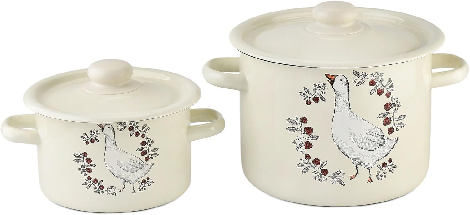 The Gusak Cylindrical Enamel Cooking Pot Set is a delightful combination of functionality and timeless charm, making it an essential addition to your kitchen. Featuring a beautiful vintage pattern, this set of two pots offers versatility and durability, catering to all your cooking needs.Each pot is crafted from enameled steel with a smooth, glass-like enamel coating, preserving the natural flavor of your food. The pots are designed for a variety of cooking methods and are compatible with gas, electric, ceramic, and induction stoves. This thoughtful design makes the set perfect for both everyday use and special occasions.The set includes two different capacities - 2.1 Qt (2 L) and 4.8 Qt (4.5 L) - to accommodate a wide range of recipes, from soups and stews to side dishes and desserts. Each pot is paired with a matching enamel lid, ensuring even heat distribution and efficient cooking. The stainless steel handles and the durable plastic knob on the lids add practicality and safety, remaining cool to the touch during cooking.Designed to last, the pots are coated with two layers of enamel for enhanced durability and resistance to wear. They are dishwasher safe for easy cleaning, and their charming design makes them perfect for serving straight from the stove to the table. To ensure their longevity, avoid heating empty pots or subjecting them to sudden temperature changes.