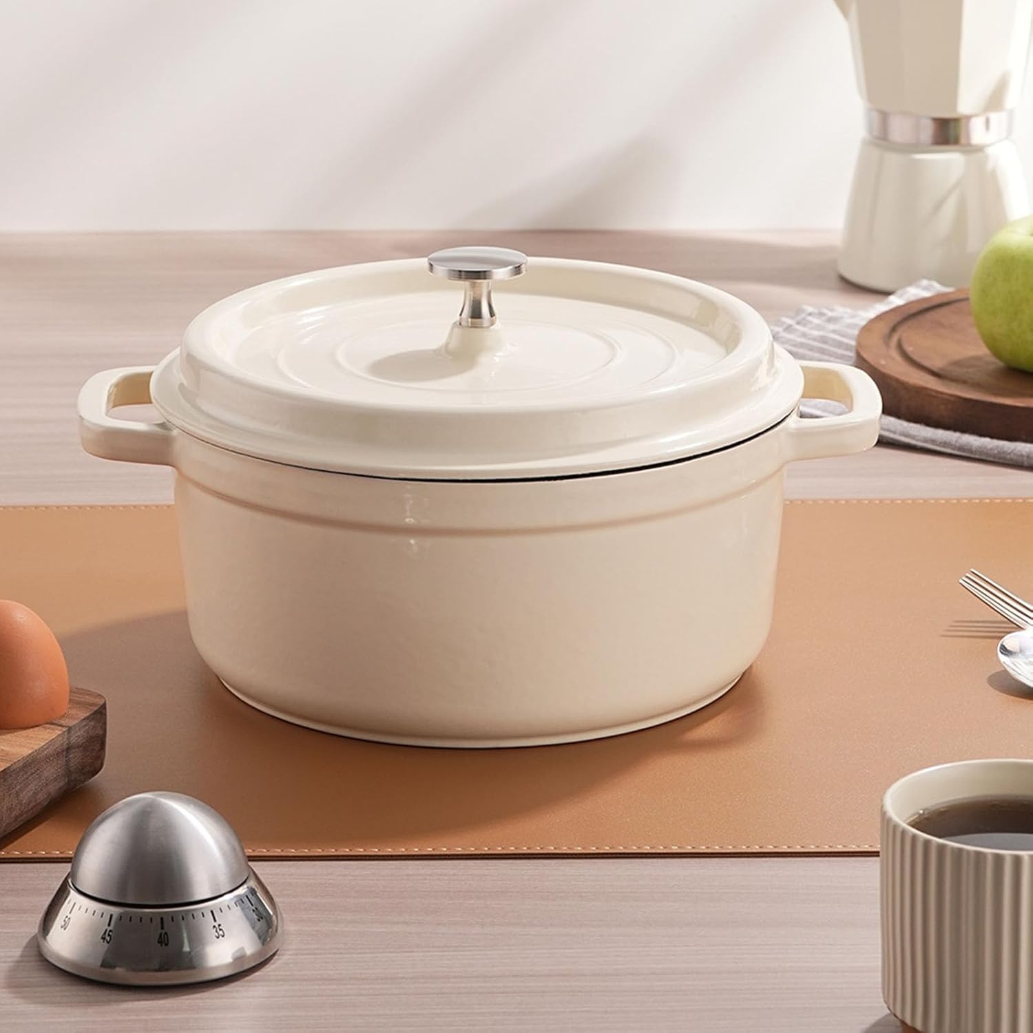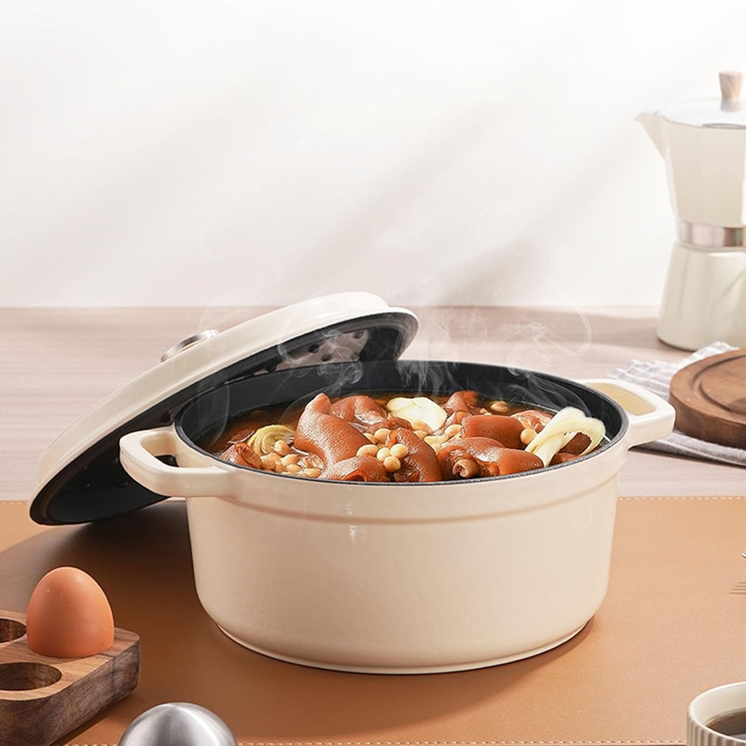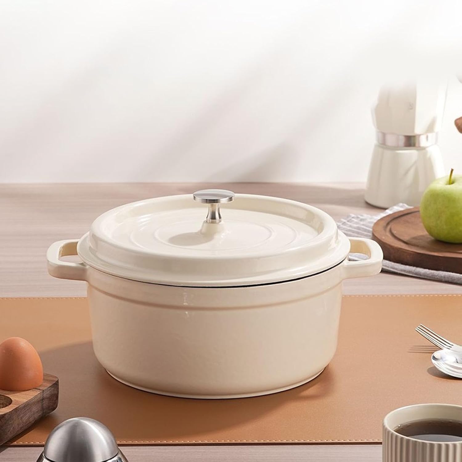 Enameled Coated Cast Iron Stockpot with Lid Heat Retaining Casserole Dish with Handle for Bread Baking Stews BraisingFeatures:superior cooking with our Enameled Cast Iron Dutch Oven Stockpot with Lid, renowned for its heat retention and even heat distribution that locks in flavor and nutrients for perfect soups, stews, and braises every time.Crafted from enameled cast iron, this multifunctional cookware features smoothly anti stick interior that resists staining, prevents rust, won't absorb food odors, and ensures effortless after use.Ideal for home chefs and cooking enthusiasts seeking versatile kitchen cookware, this heavy duty enameled cast iron Dutch oven caters to those who value both functionality and ease of maintenance in their cookware collection.Perfect for slow cooking hearty beef ribs, simmering aromatic chicken stews, roasting whole poultry, preparing seafood boils, crafting rich broths, or even cooking comforting ramen noodles for family dinners or gatherings.Enjoy versatile stovetop to table cooking; its flat base ensures stability on induction, electric, and ceramic cooktops, making it truly indispensable enameled cast iron cookware piece for culinary adventures.Specifications:Component: Cast Iron Color: WhiteSize1: Approx. 20x9cm/7.87x3.54inSize2: Approx. 22x10cm/8.66x3.94inSize3: Approx. 24x10.6cm/9.45x4.17inSize4: Approx. 26x12cm/10.24x4.72inWeight: Approx. 3000g-5000gPackage Includes:1Piece Enameled Cast Iron StockpotNote:1.Please allow 0-1cm error due to manual measurement. Be sure you donot mind before bid.2.Due to difference between different monitors, the picture may not reflect the actual color
