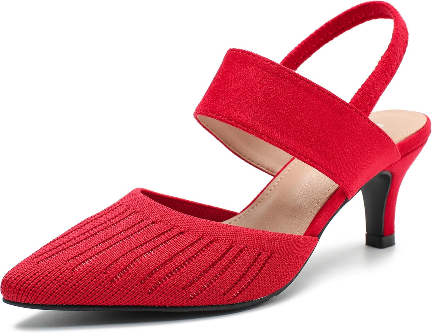 Enelauge Women's Low Heel Pointed Closed Toe Slingback Kitten Heels! These stylish pumps are the perfect addition to your party or wedding outfit. Made from knitted fabric, these breathable and fashionable shoes are available in a variety of colorful colors to match any dress.The Enelauge women's low kitten heels knit pumps feature an elastic ankle strap for a secure fit and a slingback design for added style. These comfortable and versatile shoes are perfect for all-day wear at any special occasion.Whether you're attending a wedding or a formal event, these low heel dress shoes will elevate your look and keep you feeling confident all day long. Add a touch of elegance to your outfit with these beautiful and trendy shoes from Enelauge.