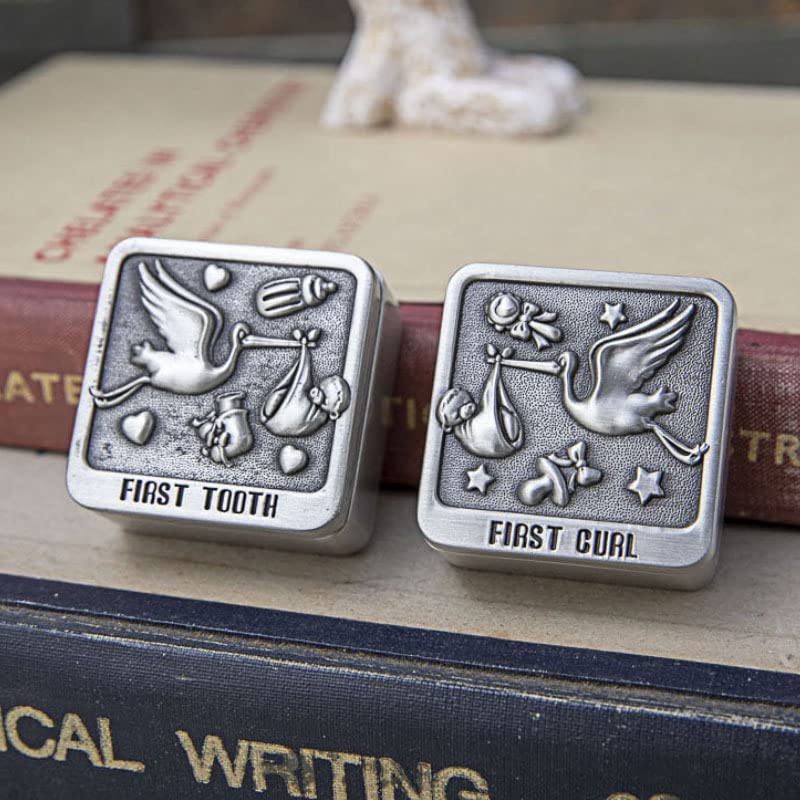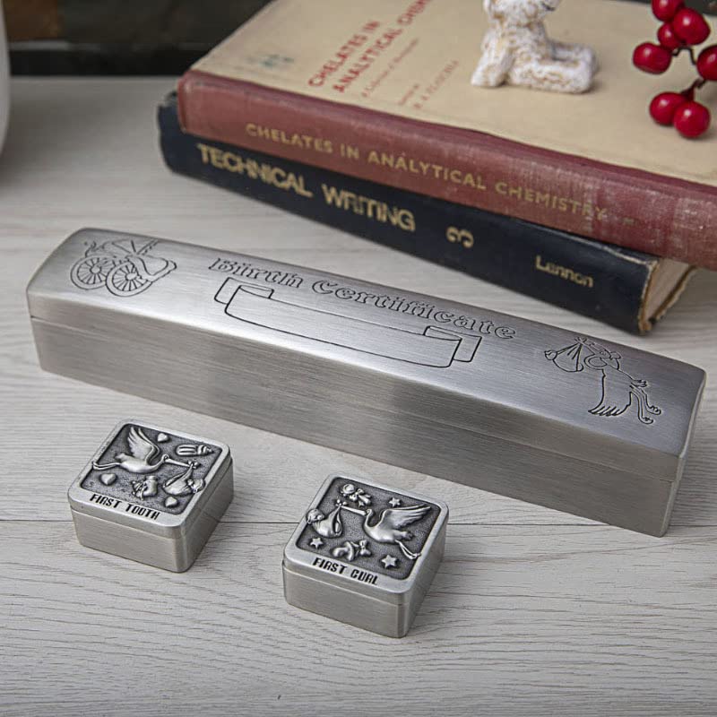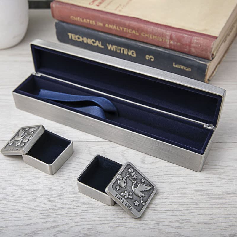 A pewter 'My First Tooth' and 'My First Curl' Keepsake Box and Engraved Birth Certificate Holder. The keepsake boxes can be personalised with an engraving across the banner on the lid of the baby birth certificate holder, making this a truly unique gift set to give to the newborn baby girl or boy. Open up each keepsake box to reveal a gorgeous velour interior designed to be kept safe for years to come.