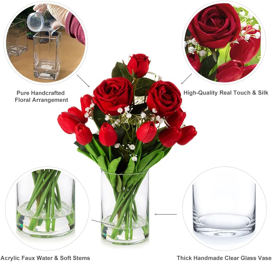 • 【Flowers Feature】Red silk rose artificial flowers with real touch fake tulip flowers with vase and faux water. Overall dimension of these decorative tulips and rose flowers with vase is approx 14H x 8W inches, Clear cylinder glass vase is 6H x 4W inches