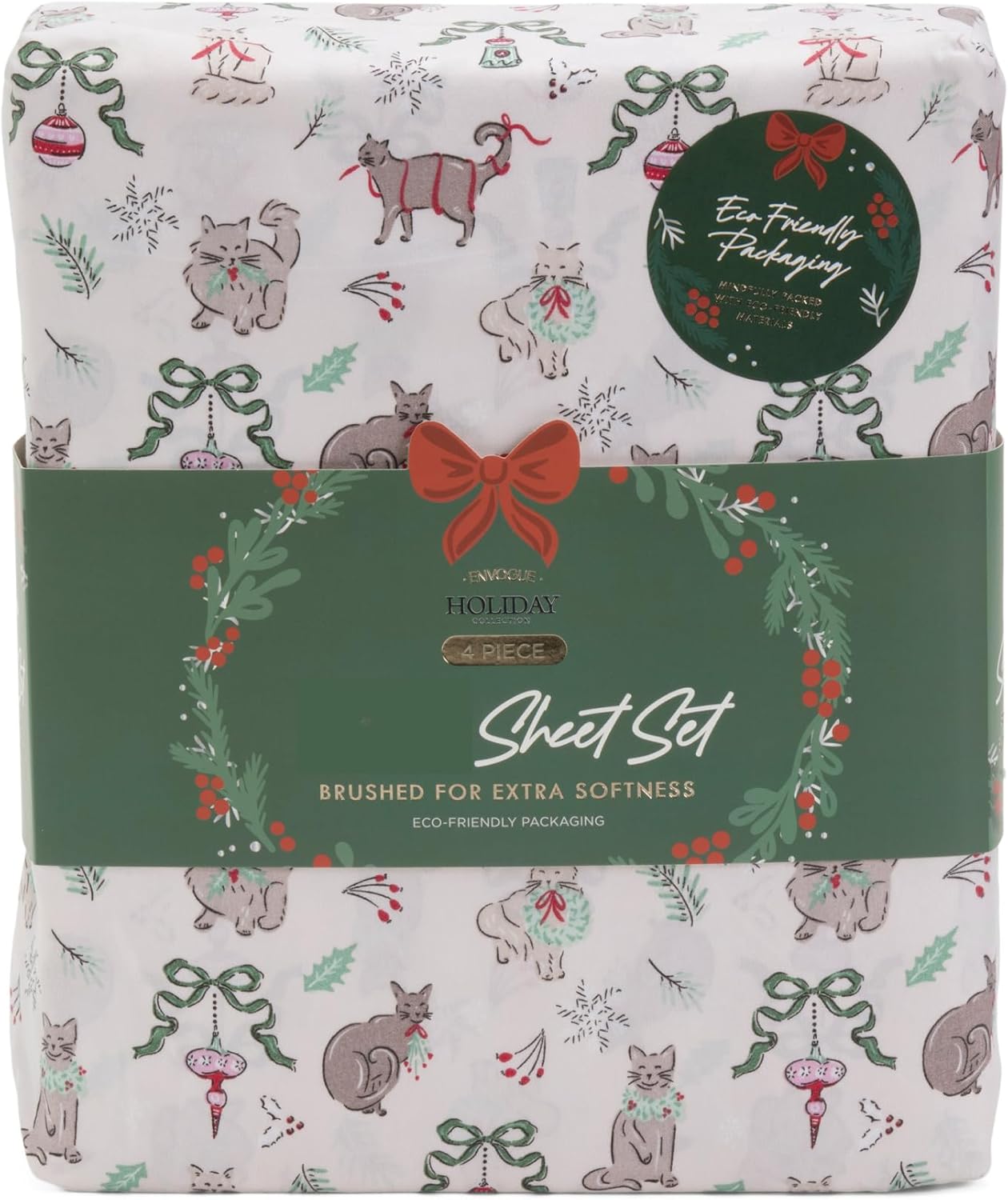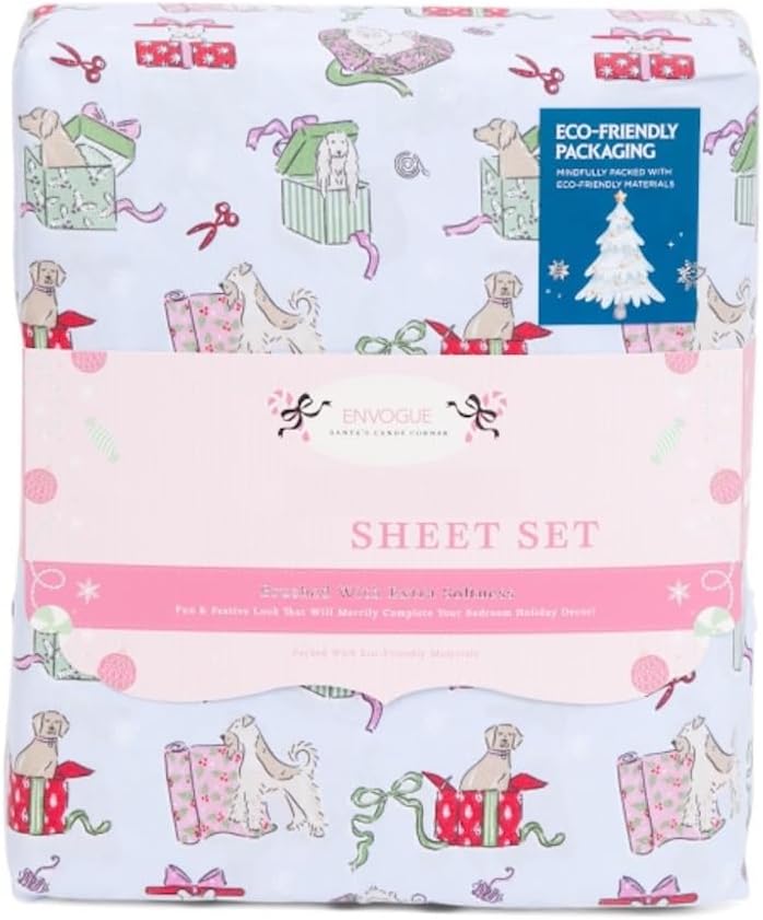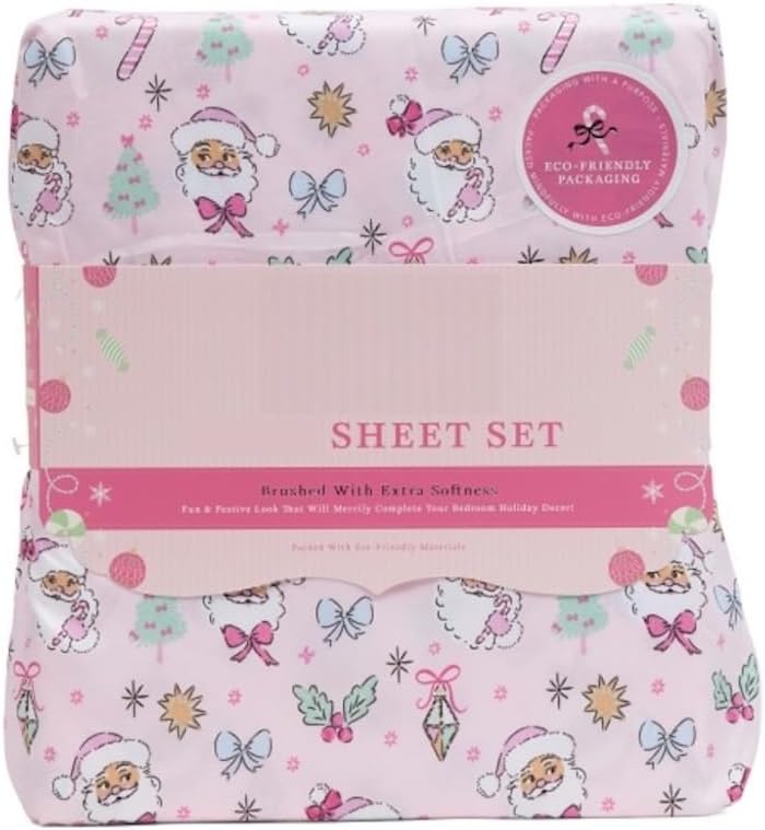 Transform your bedroom into a whimsical winter wonderland with this charming Envogue Christmas sheet set. The delightful pink background features a festive pattern of playful Santa faces, dainty bows, twinkling stars, and holiday motifs that create a sweet and magical atmosphere. Brushed for extra softness, these sheets promise a cozy and comfortable night's sleep during the holiday season. The twin-size set comes beautifully packaged and makes a perfect addition to your seasonal decor. The gentle pastel color scheme with touches of blue, mint green, and rose pink adds a sophisticated twist to traditional Christmas themes. These sheets combine festive charm with practical comfort, making them ideal for creating that special holiday ambiance in any bedroom. The playful yet elegant design ensures they'll be a cherished part of your Christmas traditions.