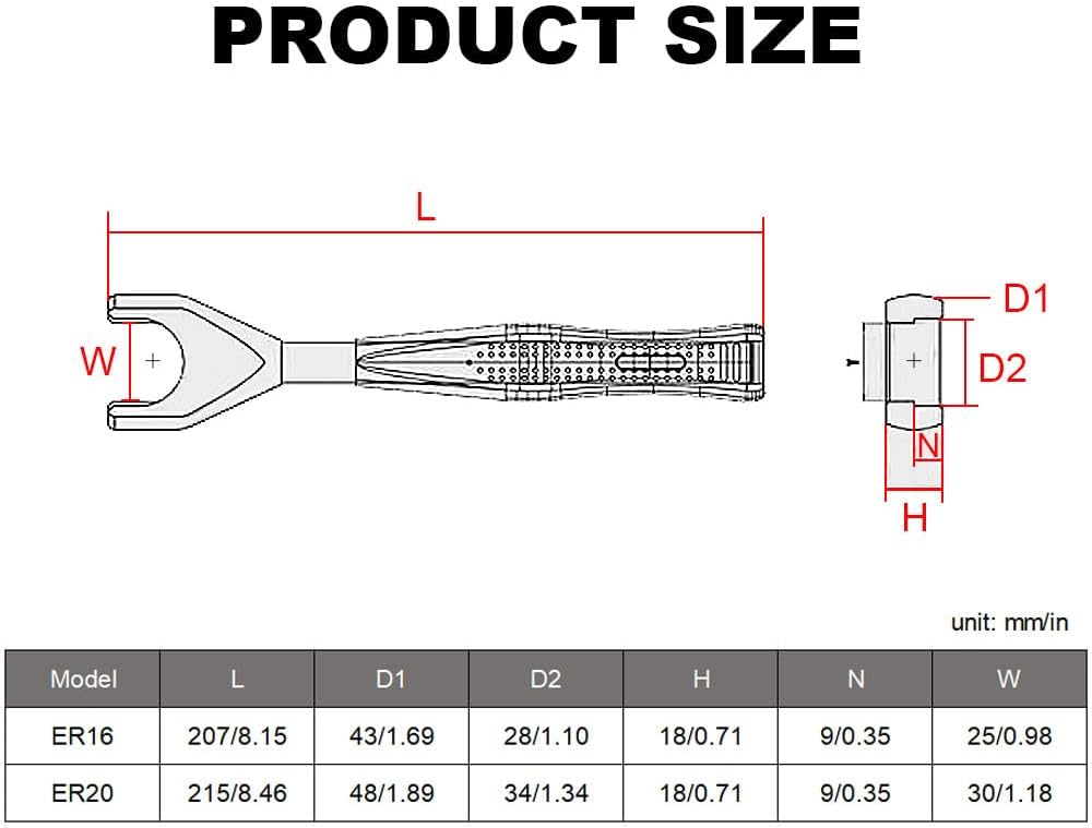 Specification: Name: ER A Style Nut Spanner Collet Chuck WrenchModel: ER16A/ER20AMaterial: 42CrMo Ultra-High-Strength SteelLength: ER16A: 207mm/8.15inER20A: 215mm/8.46inPackage Included: 1 * ER A Style Nut Spanner Collet Chuck Wrench