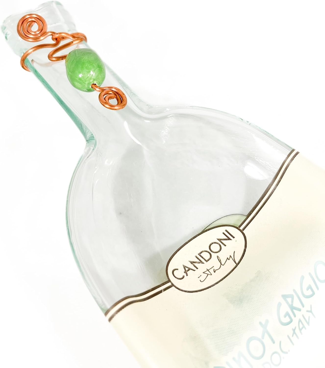 Double spoon rest or dish made out of a reclaimed wine bottle, decorated with copper and ceramic bead, with a handcrafted ceramic bead, this unique plate will take your table presentation to the next level, it can also be used as a spoon rest or as jewelry dish.