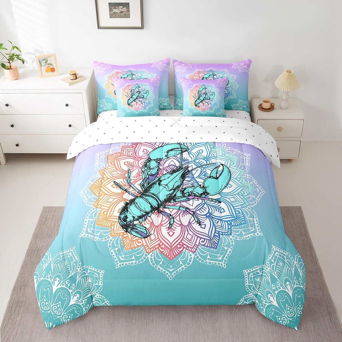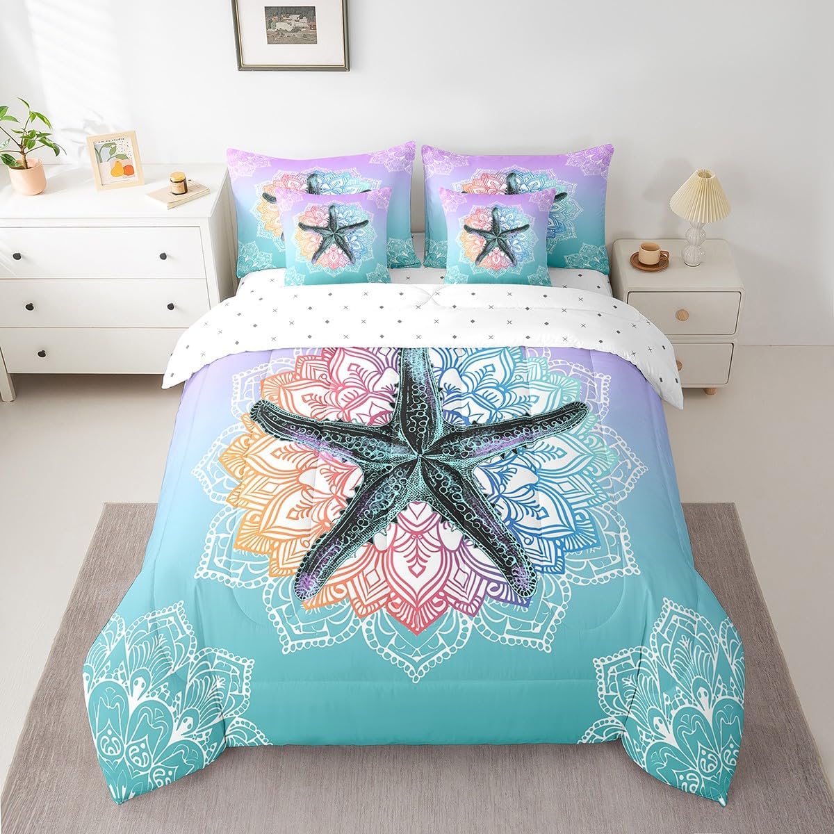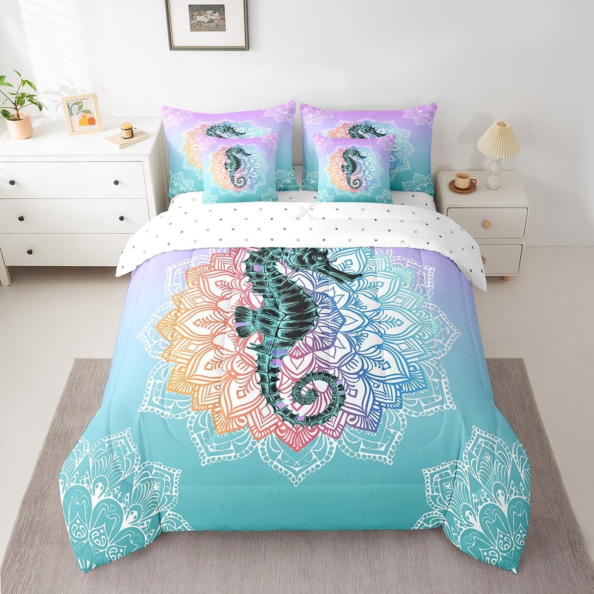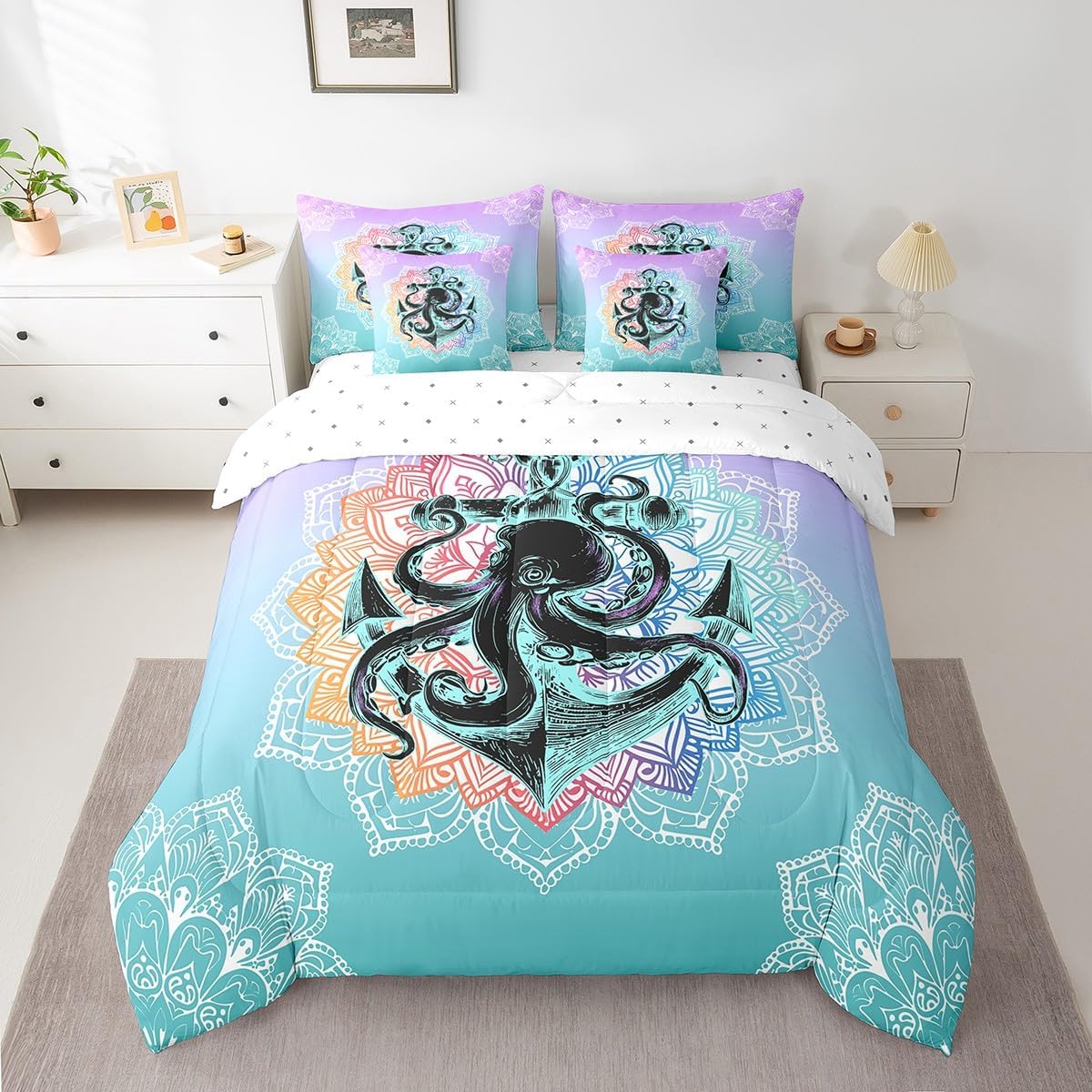 Colorful Makeover to Your Life Various size and color options, there are always decor room. Size Options: 7 Pieces Twin Size,1 Down Comforter 68"x 90", 1 Fitted Sheet 39"x75"x16", 1 Flat Sheet 96"x66", 2 Pillow Cases 30" x 20",2 Throw Pillow Covers,Covers Only. 18"x 18". 7 Pieces Full Size ,1 Down Comforter 79"x 90", 1 Fitted Sheet 54"x75"x16", 1 Flat Sheet 96"x81", 2 Pillow Cases 30" x 20",2 Throw Pillow Covers,Covers Only. 18"x 18". 7 Pieces Queen Size,1 Down Comforter 90"x 90", 1 Fitted Sheet 60"x80"x16", 1 Flat Sheet 102"x90", 2 Pillow Cases 30" x 20",2 Throw Pillow Covers,Covers Only. 18"x 18". 7 Pieces King Size,1 Down Comforter 104"x 90", 1 Fitted Sheet 78"x80"x16", 1 Flat Sheet 106"x90", 2 Pillow Cases 30" x 20",2 Throw Pillow Covers,Covers Only. 18"x 18". Decoration: For your mom, dad, sister, brother, grandma, wife, husband, and all other beloved with many surprising designs. You can find a design for everybody and every interest in our collection. Your Home,You Decide Different types of bedding sets could bring rooms in different styles. Also, rooms in different styles needs different types of bedding sets