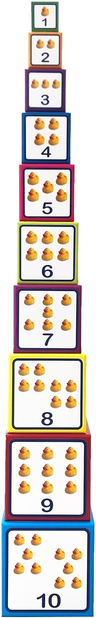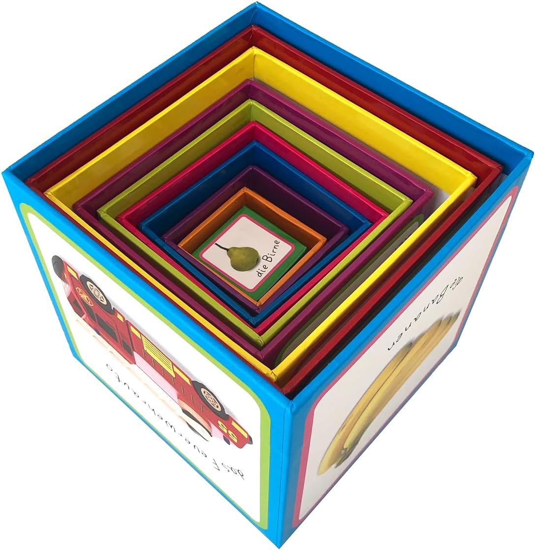 Learn words with the stacking cube! Cube for cubes to the colourful stacking tower - fun fun for toddlers from one year of age! 10 sturdy cardboard cubes with beautiful, clear photos are built into a 90 cm high tower by the little children's hands. The world of words is playfully discovered: vehicles, animals, fruit, vegetables or clothes can be seen here. Stacking, discovering and naming both language acquisition and hand-eye coordination is optimally promoted. The realistic photos help children clearly recognise the objects and learn the words. Versatile stacking tower with learning effect for children from 1 year Assemble, discard and stack again - little builders can let off steam here! By stacking and arranging by size as well as viewing and naming the building blocks, you will learn first words and numbers in a playful way. Bananas, cat, car or shoes: on the side surfaces of the stacking cubes, the little ones discover various exciting photos from their everyday life and the numbers from one to ten. And so that there is no mess in the children's room, the cubes can be easily stacked inside each other and stored in the practical box. The perfect stacking fun for bright toddlers. First learning stacking cubes - colourful building fun and language promotion in one: - 10 sturdy cardboard cubes with great everyday photos. - Space-saving storage in a practical box with carrying strap. - High-quality, strong and washable cardboard for long-lasting fun. - Promotes language acquisition and hand-eye coordination. Great stacking and learning fun for the children's room - ideal as a gift for a 1st birthday!