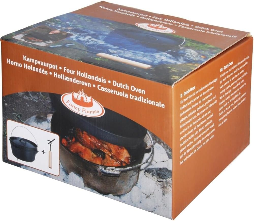 A perfect addition to our camping supplies, this dutch oven can sit directly in your open firepit to cook your favorite meals. Dutch oven sits in the included ring stand for stability and includes a lifting tool to grab metal handle when removing from fire. You can cook a variety of meals with this dutch oven and it-feets durable enough to last for many years. Measures over 10-inch in diameter and over 11-inch high.