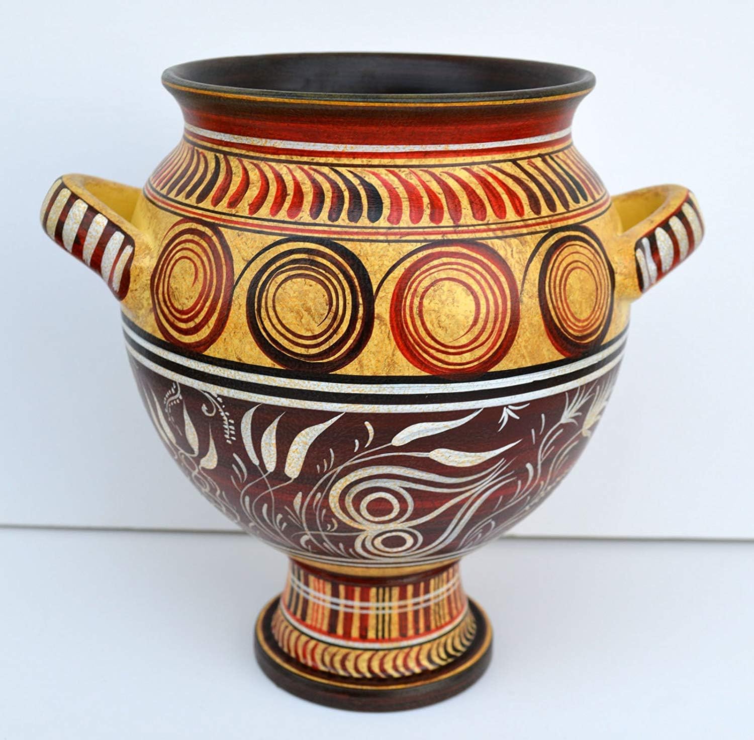 From around 2700 to 1450 BC, the Minoan civilization flourished as a seafaring and mercantile culture. This vibrant culture was centred around the island of Crete and eventually dominated the Aegean region. The Egyptians called the Minoans “the Sea Peoples” and had a fond appreciation for Minoan pottery and ceramics, prized for their innovative shapes and sea-inspired designs. Their vases and jugs were made in fine clay with thin walls and was an outstanding achievement at this time. Historians have learned everything there is to know about the Minoan people through their artwork. Artwork such as paintings, pottery, sculptures, and architectural designs were important to the people of the Minoan civilization in Crete.Our clay items are Hand painted and not fastly made, nor are they cheaply made of substitute materials such as resin. We stick to the materials and methods used by ancient Greeks and use only top quality ceramics and paints. Do not expect "perfection" as if these clay vases was not mass produced from a machine like many are, but by hand. Height: 20cm (7.9") Weight: 730g. (404/2)