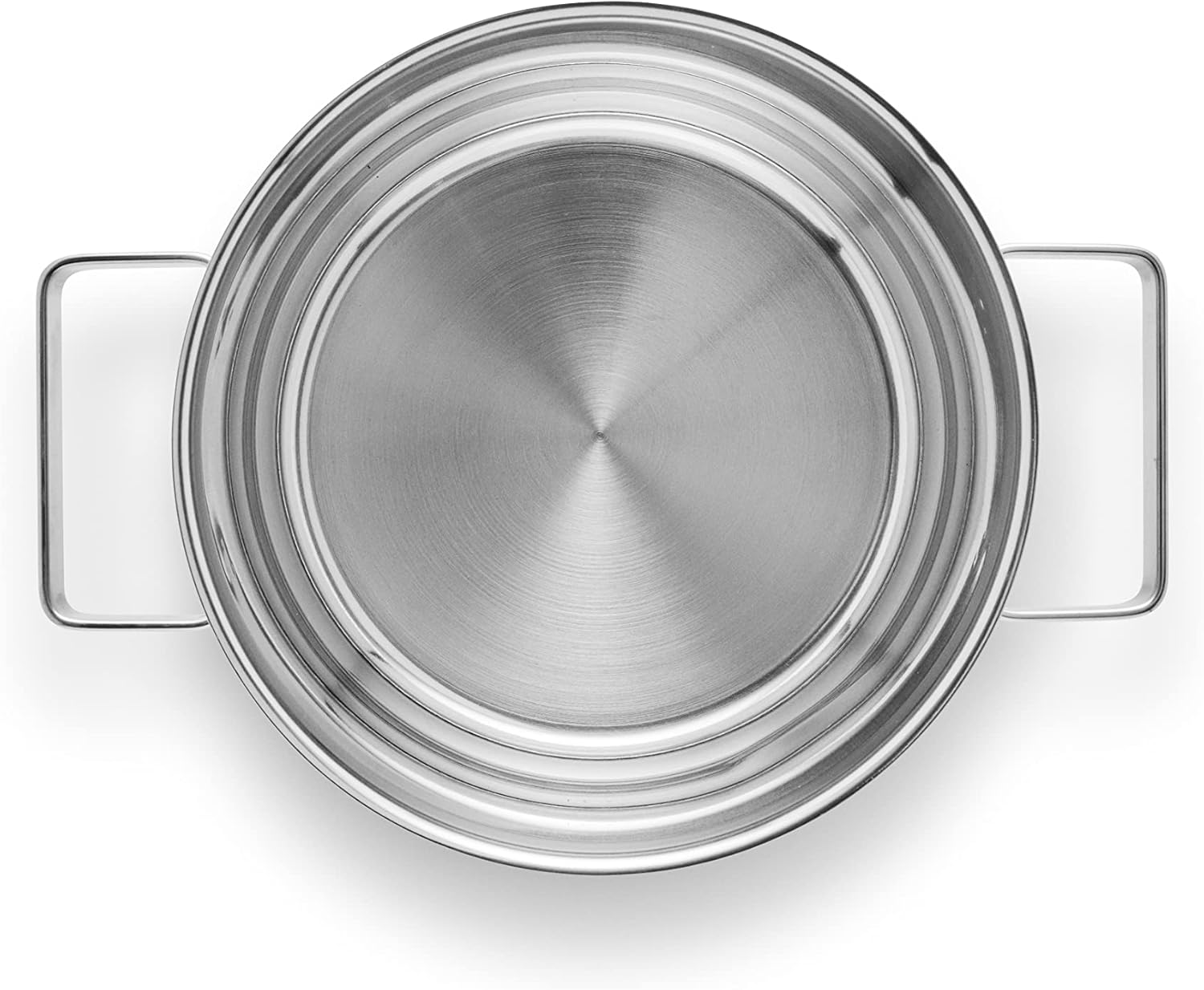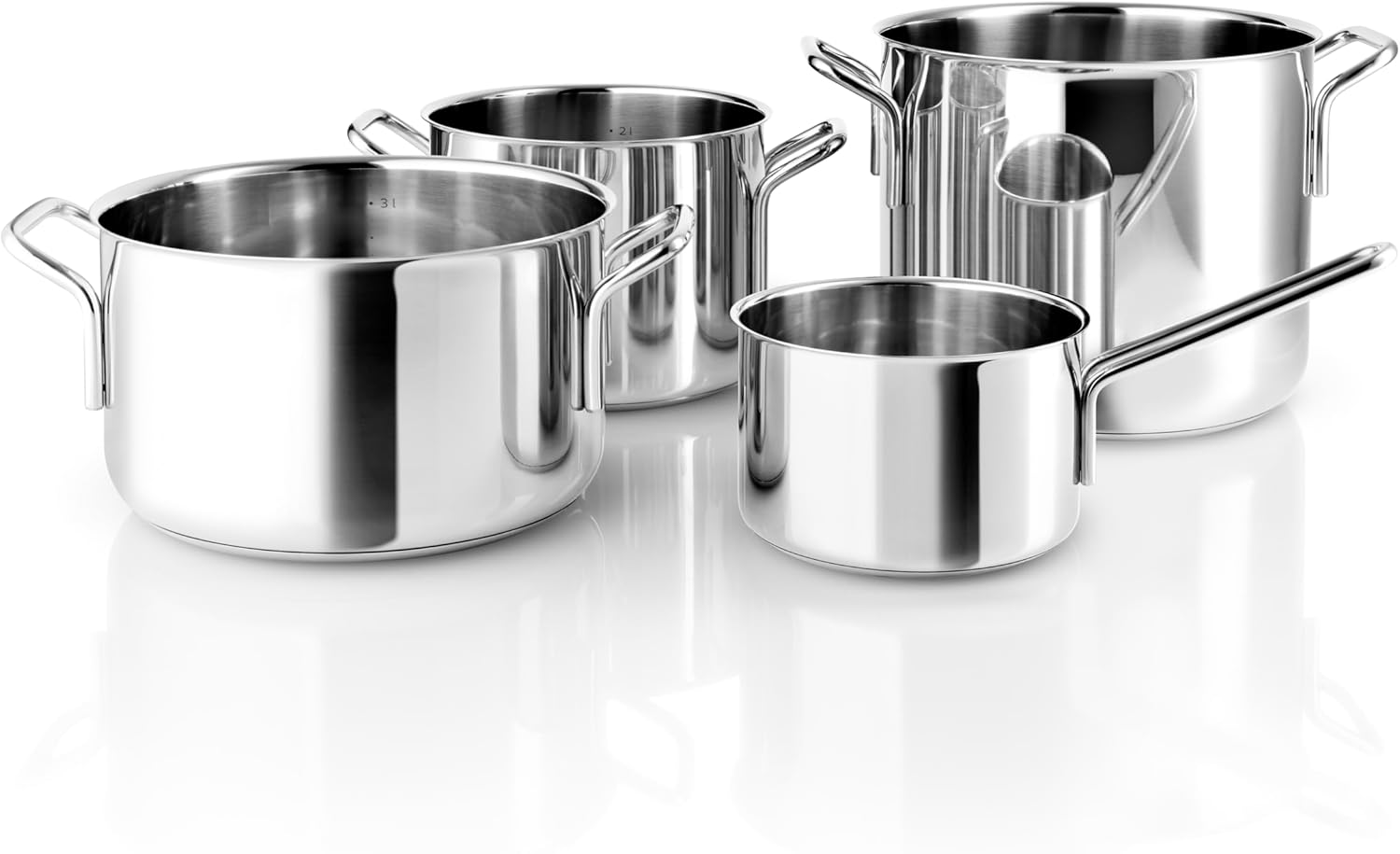 Cover every daily cooking needs with a complete set of pots. The set consists of three practical sizes that can handle everything from large stews to cooked sauces. The pot body is made from 90 percent recycled post-consumer stainless steel. The material is extremely durable and is easy to keep clean and tidy. The design is based on the classic Ole Palsby/Eva Trio design from 1977 and ensures compatibility with existing Eva Trio lids. The pots are suitable for all types of cookers and are dishwasher safe.