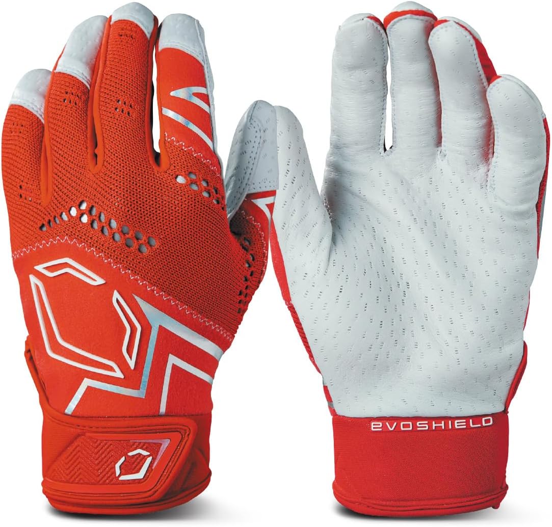 Swing for the fences with the EvoShield Pro-SRZ V2 Batting Gloves, accessories featuring Pittards leather to optimize your performance at the plate. Engineered with a Pittards leather palm, the updated Pro-SRZ V2 Batting Gloves offer a reliable grip, lightweight feel and durable comfort through dozens of hacks in the cage or on the field. The performance knit backhand features vented holes for improved breathability, and flexible Lycra inserts allow the gloves to stretch with your hands. Make easy adjustments between pitches with the molded neoprene cuff, then strap in and make a difference at the dish. - Men's sizing - Sold as a pair - Pittards Leather palm for enhanced grip, durable performance and lightweight feel - Lightweight performance knit backhand - Vented holes for breathability and enhanced comfort - Lycra inserts for flexibility and full range of motion - Molded neoprene cuff allows for quick and easy adjustments - Luminous iridescent accents