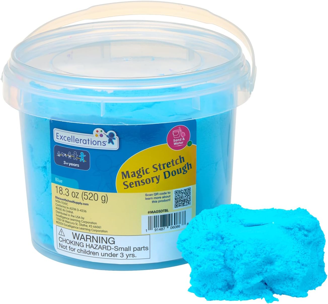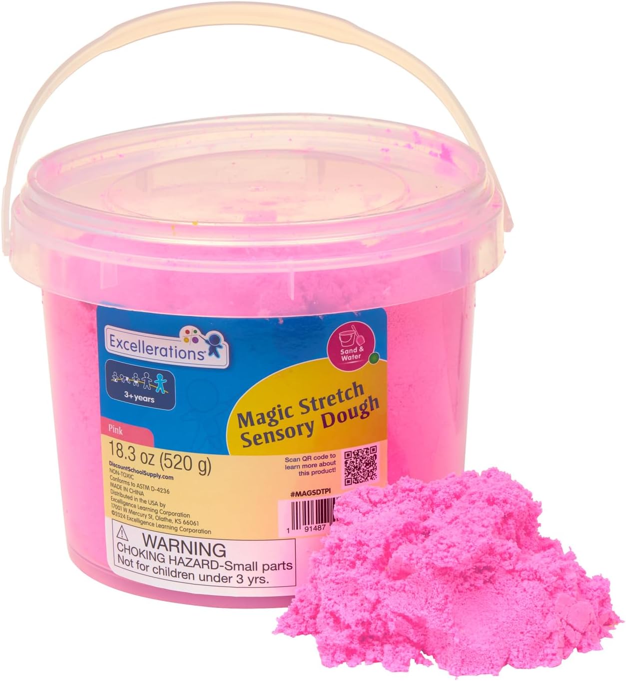 Ages 3+ / Grades PreK+ WARNING: CHOKING HAZARD – Small parts. Not for children under 3 years. Magic Stretch Sensory Dough for Kids - Safe, Non-Toxic, Easy to Clean Stretch, Squish and Create with this Sensory Dough that feels like Ultra-Soft Cotton Candy. Perfect for Sensory and Sand Tables with Storage Container WHAT YOU GET: 18.3 oz of Magic Stretch Sensory Dough, packaged in a resealable storage container. Suitable for ages 3 and up. INCREDIBLE STRETCHABLITY: Stretches effortlessly for hours of fun. Perfect for soothing sensory play, helping kids relax, focus, and develop important fine motor skills. SILKY COTTON CANDY TEXTURE: Features an ultra-soft, silky texture that feels just like cotton candy, offering a sensory experience kids love-without the stickiness! SAFE & NON-TOXIC: Made with high-quality, non-toxic materials for worry-free playtime that's safe for kids of all ages. PERFECT FOR SENSORY AND SAND TABLES: Great for use in sensory play environments, sand tables, or play bins. Ideal for indoor or outdoor play. ENGAGING SENSORY EXPERIENCE: Perfect for soothing sensory play, helping kids relax, focus, and develop important fine motor skills. Experience the ultimate sensory play with our Magic Stretch Sensory Dough! This ultra-soft, non-sticky dough stretches effortlessly, offering kids endless opportunities to squish, create, and explore their imaginations. Perfect for calming sensory play, it helps children relax, focus, and develop important fine motor skills. Made with safe, non-toxic materials, this dough is ideal for kids of all ages and worry-free for parents. Plus, its mess-free formula ensures easy cleanup, making it a favorite for both home and classroom use. Give your child the gift of endless fun and creativity with this unique sensory dough!
