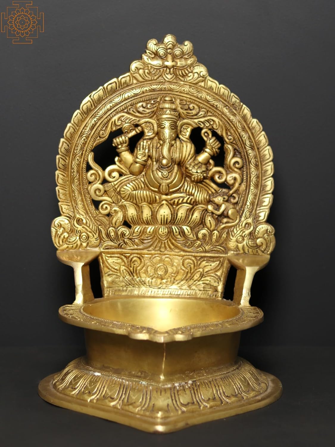 Exotic India Art Pvt. Ltd. This exquisite oil lamp, crafted from radiant brass, embodies the spirit of auspicious beginnings and divine blessings. At its heart, Lord Ganesha, the beloved elephant-headed deity, is depicted in a posture of serene contemplation and benevolent power. Known as the remover of obstacles and the lord of wisdom, Ganesha is invoked at the commencement of all ventures, from grand ceremonies to daily rituals, ensuring success and prosperity. The intricate detailing of the brasswork captures the divine essence of Ganesha, with each carved line contributing to a sense of sacred artistry. The lamp's design is a testament to traditional Indian craftsmanship. The archway behind Ganesha is adorned with elaborate patterns and motifs, creating a halo of divine presence. The inclusion of his vahana, the mischievous mouse, a symbol of earthly desires and the need to control them, adds another layer of symbolism to the piece. The flowing lines and ornate curves speak to a rich artistic heritage, transforming this functional object into a piece of devotional art. The substantial brass construction ensures durability and a timeless aesthetic, promising to be a cherished item for generations. The presence of Lord Ganesha, seated majestically above the flame, imbues the lamp with his protective and auspicious aura. His gentle gaze and the blessings he bestows are believed to extend through the light, safeguarding those who worship him. This lamp is more than just an object; it is a spiritual anchor, a focal point for devotion and meditation. Whether placed on an altar, in a prayer room, or as a decorative piece in your living space, it brings an element of sacredness and a reminder of the divine presence in everyday life. The warm, golden hue of the brass further enhances its spiritual appeal, resonating with the sacredness of light and purity.