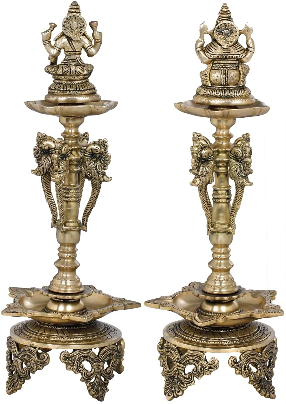 Exotic India Pvt. Ltd. This 19 Inch Lakshmi Ganesha Auspicious Lamps in Brass set features Goddess Lakshmi and Lord Ganesha, revered together as symbols of prosperity, wisdom, and auspicious beginnings. The deities are shown integrated with traditional oil lamps (deepams), emphasizing the role of light in spiritual practices as a symbol of knowledge, purity, and positive energy. Ganesha represents the remover of obstacles and the giver of success, while Lakshmi embodies abundance, fortune, and well-being. The balanced composition and calm expressions convey harmony and blessings, making the lamps suitable for daily worship and ceremonial use. Crafted in solid brass using traditional metal casting techniques, the lamps display fine detailing in the facial features, ornaments, attire, and lamp bowls. The natural brass finish enhances the sculptural depth and reflects the handcrafted character of the pieces.With their substantial 19-inch height, these Lakshmi Ganesha brass lamps are ideal for home temples, pooja rooms, entrances, festive rituals, and auspicious occasions such as Diwali, Lakshmi Pooja, and housewarming ceremonies. They serve both as functional oil lamps and as meaningful devotional décor.