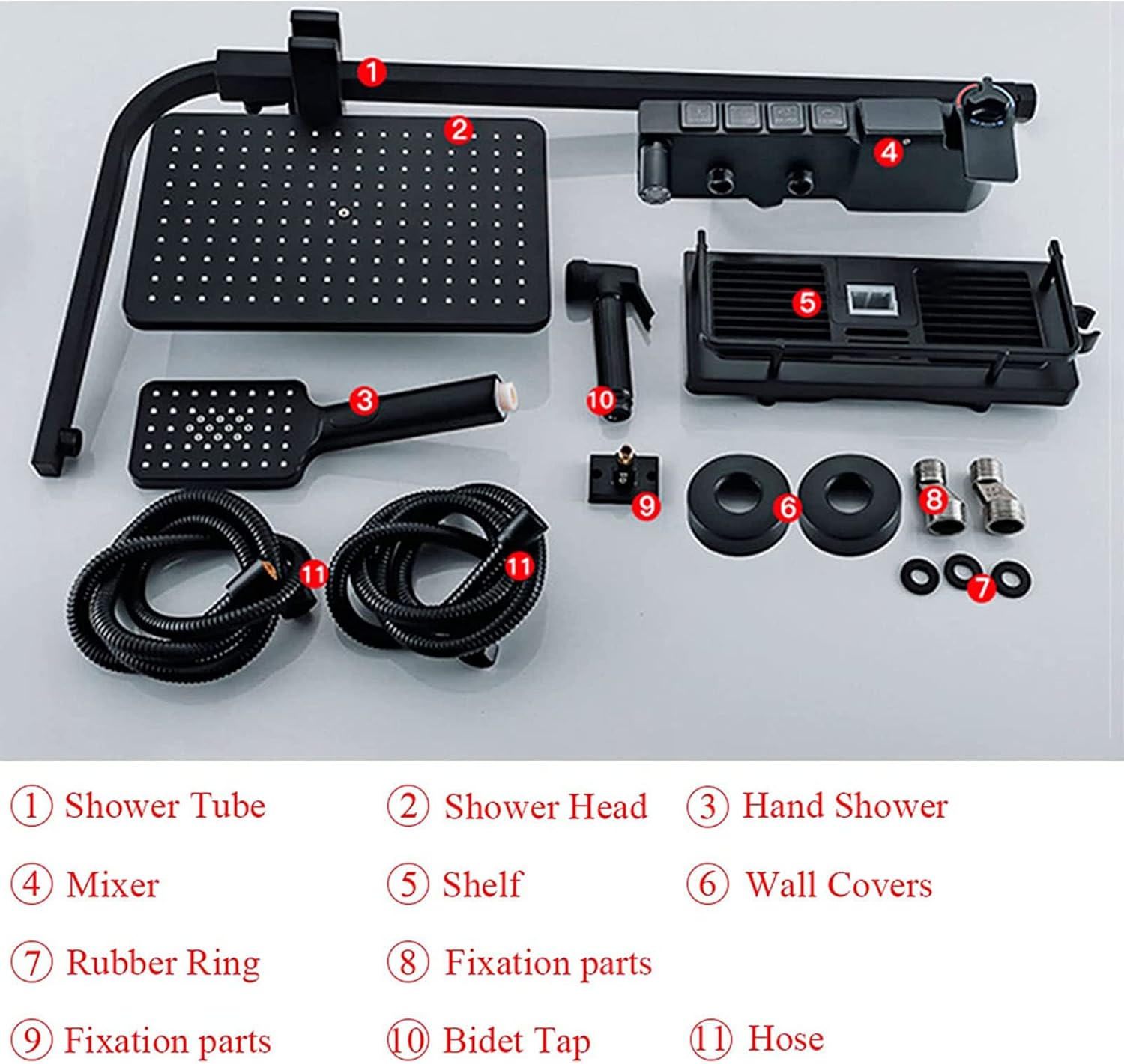 ? Bath & Shower Faucet Type: Bathroom Shower Faucet SetType: Thermostatic Shower FaucetType: Temperature Display Shower FaucetLCD Power From: Water flow GeneratorBody Material: BrassShower Head Material: ABSHand Shower Material: ABSBidet Sprayer Material: BrassValve Core Material: CeramicNumber of Handles: Single Handle Finish: Matte BlackFeature: Cold and Hot Water Mixer TapCold/Hot Water Control Type: Single Holder Dual Control: ContemporaryType: Fixed Support TypeInstallation Type: Wall Mounted4 Functions Shower suit: Rainfall Shower Head, Hand Shower, Tub Shower, Bidet ShowerExposed Shower Faucet Feature: with Shower BarInstallation Hole Distance 13.3-16.7cmSuggestion: Faucet should be installed 80-100cm above the floor? We focus on creating perfect bathroom fixtures experience for our customers, and constant pursuit of doing better by services and designs? Remarks: This shower set please let the professional plumbers to install it, then can let yours enjoy good bath in the bathing, thank you
