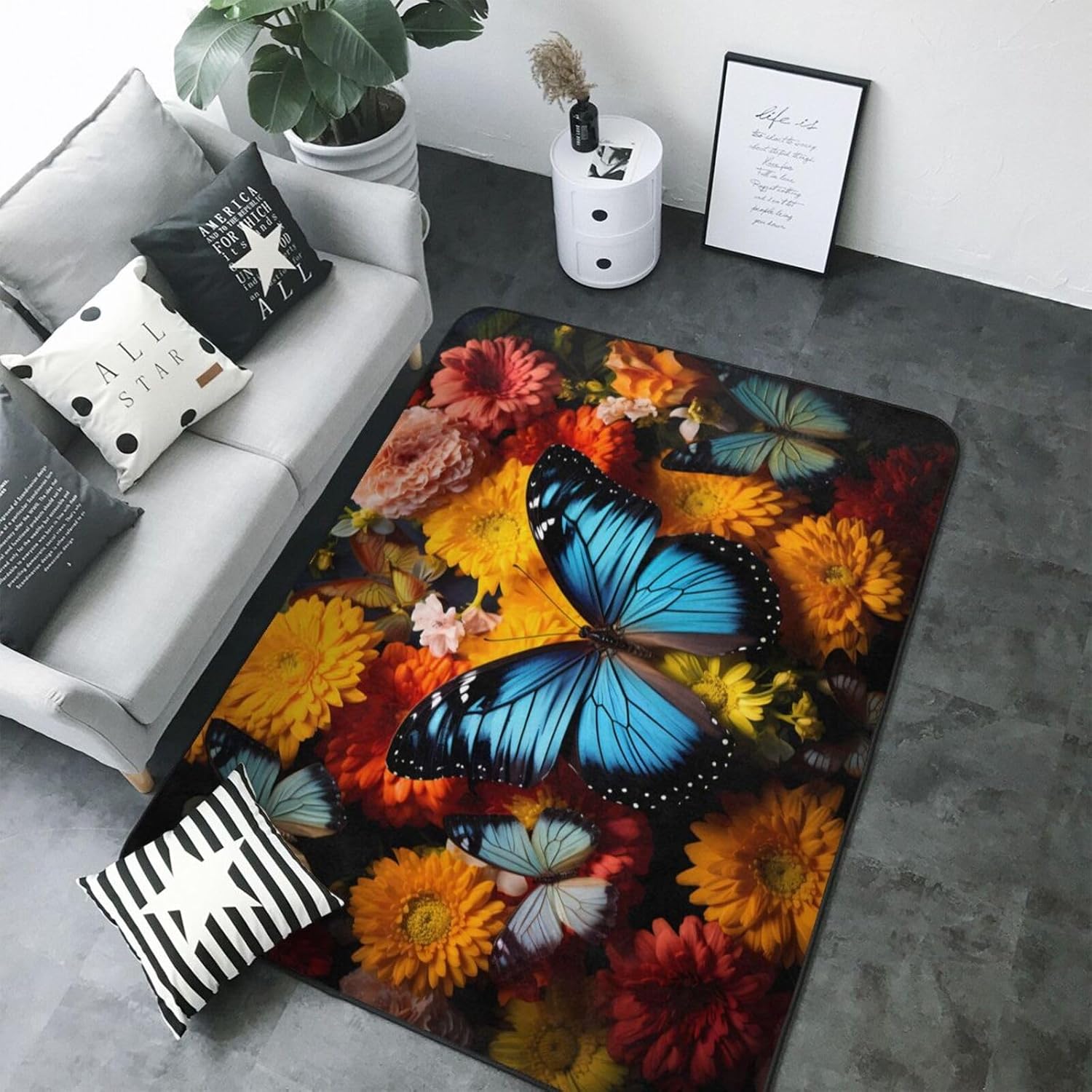 This Exquisite Butterfly printed decorative carpet is made of polyester flannel, which is delicate and soft to the touch, with tight and regular pile. It will not pill or fade after long-term use, and will always look like new. The middle layer uses high-density memory foam, which can automatically adjust according to the foot shape and pressure, providing precise massage for tired feet and relieving fatigue. The bottom is designed with non-slip plastic bottom non-woven fabric, which can firmly grip the ground even when it encounters water or on smooth surfaces, ensuring the safety of the elderly and children. It is easy to clean daily, can be machine washed or hand washed, and is wear-resistant and does not shed. Exquisite stitching technology and high-quality tailoring, with smooth edges, are suitable for a variety of scenes such as bathrooms, living rooms, and bedrooms. Non-slip, comfortable, and durable, adding a touch of intimacy and elegance to your life.