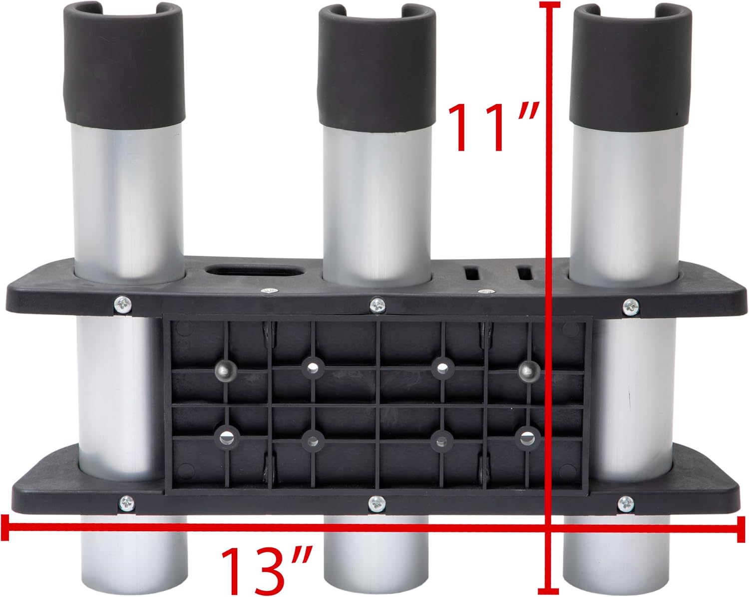 Keep all your rods ready in one place! Mounting directly into your Tracker's Versatrack system, the 3-rod holder features three durable aluminum rod holders, perfect for transferring your gear to and from your favorite fishing hole. Slotted rubber caps on each rod tube hold the rods steady while protecting the rod from abrasions and scratches caused by boat vibrations and rough water. The holder also includes tool slots to store your fishing knives, a pair of scissors, extra lures, and more. The unit's oversized plastic knobs make it easy to install, remove, and move around your track system to set you up in that perfect spot.