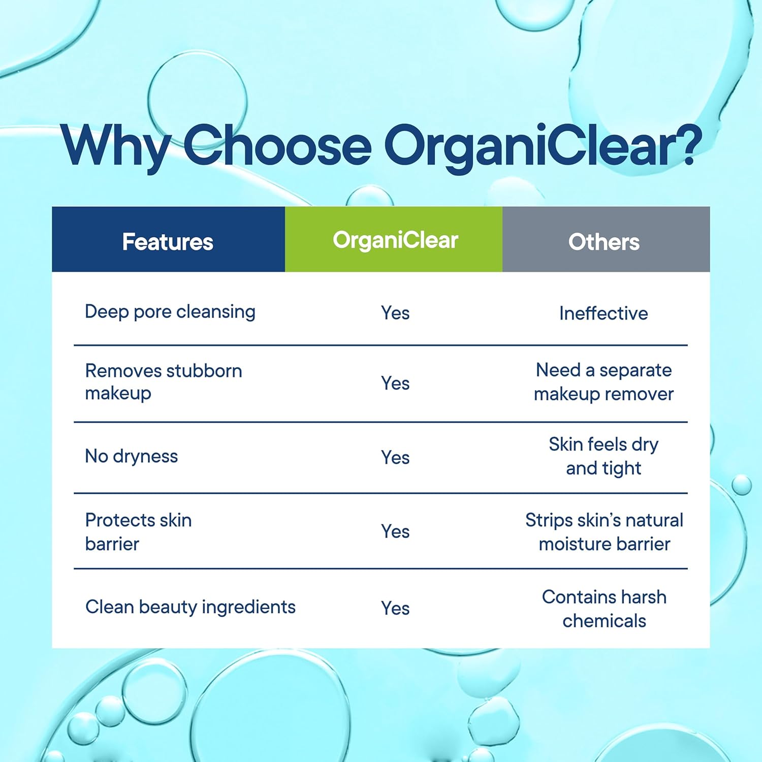 OrganiClear Facial Cleanser with Organic Tea Tree & Salicylic Acid – Gentle Daily Foaming Gel Face Wash for Deep Cleansing & Makeup Removal – Unclogs Pores, Eliminates Dirt & Oil, Without Any Dryness, Protects Skin Barrier, Travel Size (2 oz)POWERFUL YET GENTLE DAILY CLEANSER: This gentle, foaming gel cleanser effortlessly removes stubborn makeup, sunscreen residue, and dirt & oil. No need for separate makeup removers. Leaves your skin amazingly clean & clear, without any dryness.DEEP PORE CLEAN & EXFOLIATION: Organic tea tree extract and mild salicylic acid work together to gently unclog pores, eliminating trapped dirt, oil, and impurities. Gets all the gunk out! Visibly reduces pores. Exfoliates away dead skin cells to leave your skin fresh and glowing.SOOTHES & NOURISHES SKIN: Enriched with glycerin and organic amaranth, this cleanser conditions skin and protects the skin’s natural moisture barrier. Rinses exceptionally clean with no pore-clogging residue, and without any dryness. The result is soft, smooth, and glowing skinCLEAN BEAUTY INGREDIENTS & MADE IN USA: We carefully chose the cleanest, science-backed ingredients that deliver results. Free from sulfates, harsh detergents, parabens, phthalates, mineral oil, artificial colors, and fragrances. Our formula is 100% vegan and cruelty-free. No animal testing. Enjoy a luxurious skincare routine knowing that it’s gentle on your skin and kind to the planet.SUITABLE FOR ALL SKIN TYPES AND AGES: This gentle, non-comedogenic cleanser is suitable for all skin types, even sensitive. Also great for acne-prone skin. All genders, and all ages.