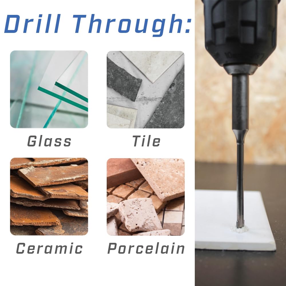 The Carbide Hard Tile & Glass Drill Bit is designed for drilling through glass and medium-wear tiles, making it a great choice for tasks like glass cutting, installing bathroom fixtures, mounting mirrors, and fastening screws in tiles. The drill bits come equipped with a high-quality carbide tip and reinforced head that minimizes stress and prevents the drill bit from cracking, leading to a longer lifespan. When used with a small amount of water lubricant, it can drill clean and precise holes up to 10 times in porcelain tiles. When used with a small amount of water, it can drill clean and precise holes, allowing for up to 10 times in porcelain with water cooling. Size: 120mm x 7mm