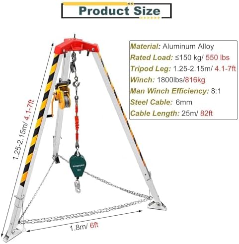 EMERGENCY FIRE RESCUE ROPE SYSTEM: This tripod storage is the ideal tool for traditional confined spaces, providing safe passage and emergency rescue, perfect for use in wells, sewers, underground pipes and tunnels. Specifications Material: Aluminum Alloy Adjustable leg length: 1.34-2.14m/4.4-7ft Man winch continuous efficiency: 8:1 Manual handle force: 500 N Safety factor: 10 Wire and cable length: 1200LBS winch - 20m/65.6ft - 5mm diameter, 1800LBS winch - 25m/82ft - 6mm diameter, 2600LBS winch - 30m/98ft - 7mm diameter Safe load capacity: 1200LBS winch safe load 200KG/440LBS; 1800LBS winch safe load 250KG/550LBS; 2600LBS winch safe load 300KG/660LBS Package Contents 1 x Rescue Tripod Kit (Including Winch, Steel Cable, Safety Belt, Fall Protection Device) Features: Sturdy steel and aluminum alloy to ensure safety. Self-locking winch and anti-fall protector Adjustable legs Non-slip feet Foldable for easy carrying Due to the large size of the package, it will be shipped in two parts. Note that there will be an error of 1-3cm due to manual measurement. Please understand that there will be slight color differences due to differences in light and personal understanding of color. The actual product may have different stocks.