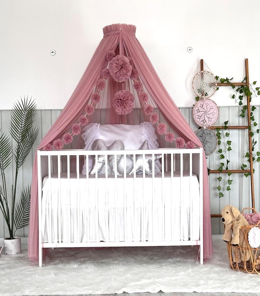 This beautiful bed canopy made of soft tulle will be the eye-catcher in the baby's room. The 2 pom poms, the pompom garland and the butterflies are included. 100% handmade. For technical reasons, slight colour variations are possible. Decoration is not included. Care instructions: washable at 30 °C (gentle mode), do not tumble dry, do not bleach, do not iron, material: 100% polyester