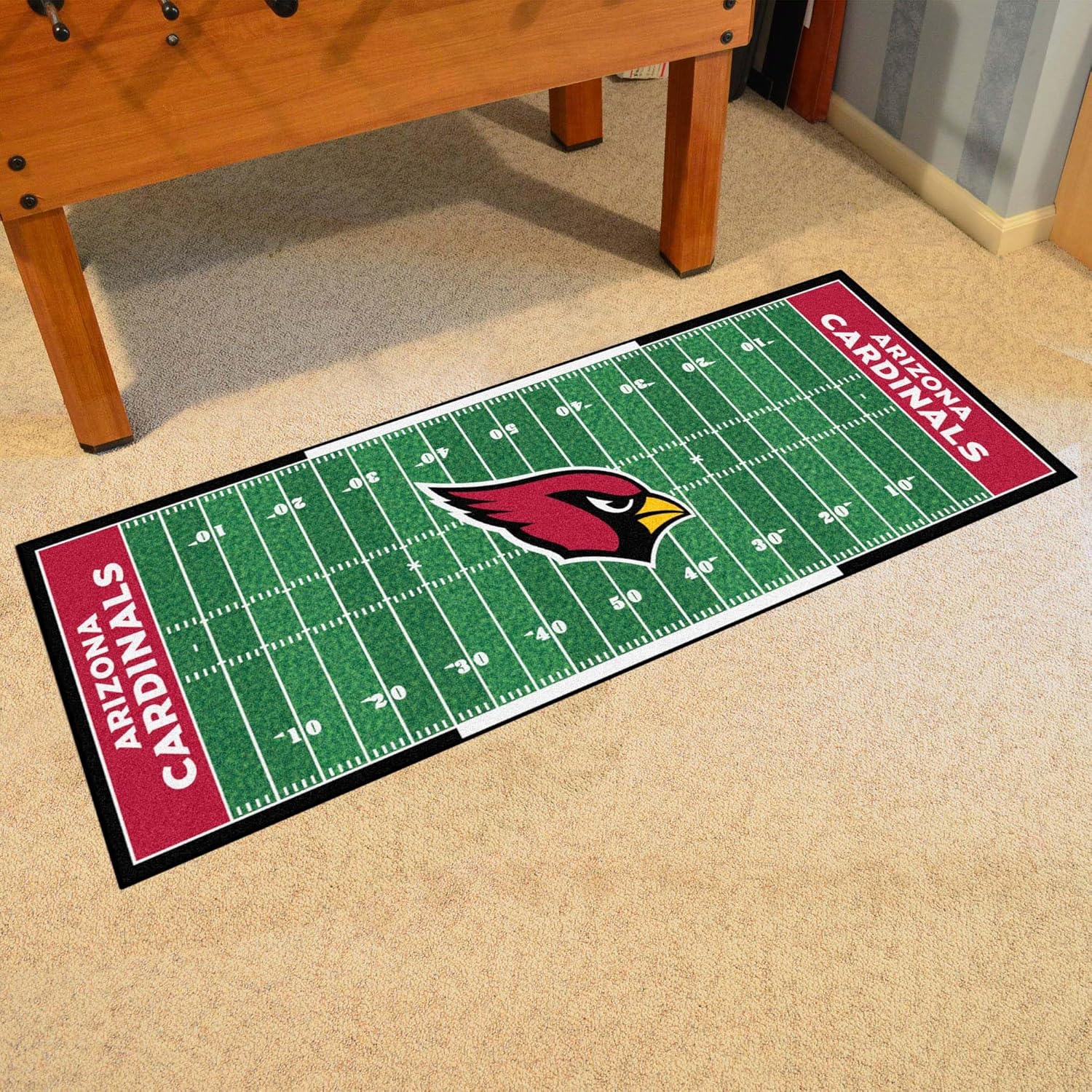 Always be at the field with Sports Licensing Solutions Football Field Runner Mat. With the same design as your favorite teams actual field you can always be with your team even at home. At 30 inches tall by 72 inches long this mat is perfect for any game room, man cave, or next to your bed. The carpet is a soft nylon so that is can hold up against moderate to high foot traffic. To make sure that the mat last for years we have used vinyl for the backing and then surged the edges of the mat. Made in the USA.