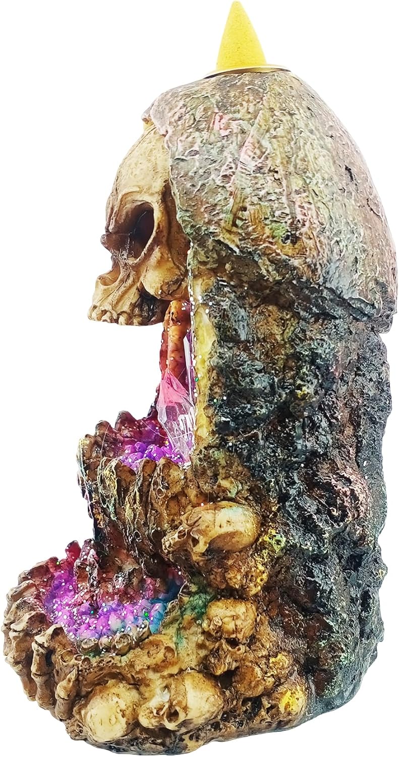 The Fantasy Gifts Geode Skull Backflow Burner with LED – 6.5 Inches is a bold decorative accent that blends gothic symbolism with mystical crystal-inspired design. Featuring a detailed skull form accented by a vibrant geode-style interior, this piece adds drama, intrigue, and fantasy flair to any space. The skull design is carefully sculpted with realistic contours and expressive detailing, while the crystal geode center introduces a striking contrast of color and texture. This combination creates a visually powerful décor piece that appeals to gothic art collectors, crystal enthusiasts, and fantasy décor lovers alike. Designed with a backflow waterfall channel, this décor accent creates a cascading visual effect that introduces motion and atmosphere. The downward flow enhances calm environments while maintaining a dramatic aesthetic, making it suitable for meditation corners, relaxation areas, or themed décor displays. An integrated LED light softly illuminates the geode interior, bringing the crystal textures to life. The glowing effect enhances the cascading display and highlights fine sculpted details, creating a captivating focal point in both daylight and low-light settings. The light-up feature adds depth and visual interest, making the piece especially appealing during evening décor arrangements. Standing approximately 6.5 inches tall, this skull décor piece offers the perfect balance of size and presence. It fits comfortably on desks, shelves, altars, side tables, or display cabinets, making it versatile for a wide range of spaces without dominating the room. Crafted from durable, high-quality resin, the Geode Skull Backflow Burner is designed for stability and long-term decorative use. The solid base keeps it securely positioned on flat surfaces, while the resin construction preserves intricate details and painted finishes over time. Maintenance is simple, allowing the piece to retain its beauty with minimal care. This décor accent complements a variety of interior styles, including gothic, fantasy, mystical, boho, and alternative décor themes. It pairs well with crystal displays, skull collections, and other fantasy-inspired accents. As a gift, the Fantasy Gifts Geode Skull Backflow Burner with LED is distinctive and memorable. Ideal for skull collectors, crystal lovers, fantasy décor fans, and anyone who appreciates bold and imaginative home accents, it makes an excellent choice for birthdays, holidays, housewarmings, or themed gifting occasions. The Fantasy Gifts Geode Skull Backflow Burner – 6.5 Inches combines dramatic design, flowing visual elements, and ambient lighting into one captivating décor piece that elevates any space with mystical charm.