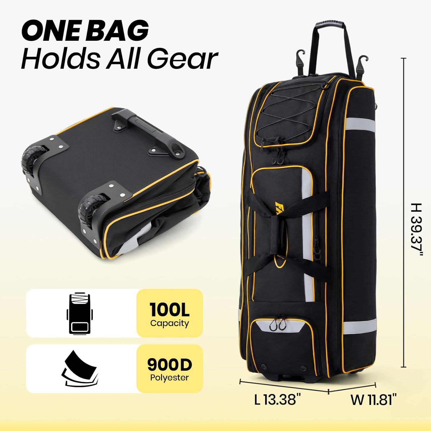 Engineered for athletes at every level—from youth to adult—this smart, rugged gear bag is the essential teammate for baseball, softball, hockey and more. Smooth Mobility: 360° wheels & a reinforced base glide smoothly over any surface. Upright Stability: A unique internal frame keeps the bag standing firm for easy access. Max Organization: 100L capacity with 3 dedicated zones, plus 4 bat sleeves and 8 pockets. Fence Hook System: 5-point hook system keeps gear clean, dry, and ready to use. Built to Last: Made from rip-resistant 900D fabric to withstand rain, mud, and rough use.