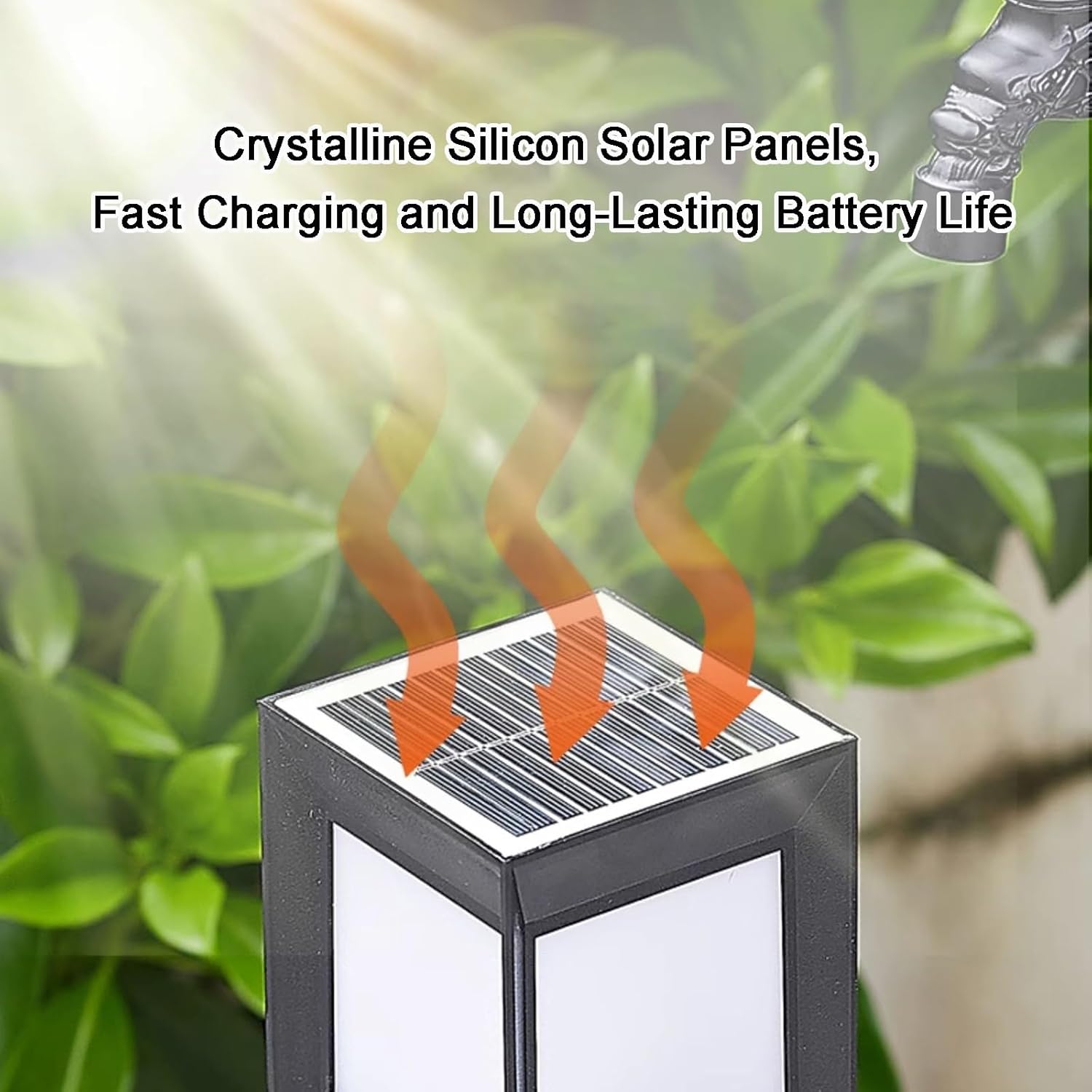 Our outdoor water column has a waterproof solar panel on the top, intelligent sensing, and light up after dark. It can be fully charged in 4 to 7 hours of daylight and can be on for about 8 to 12 hours. It can be fully charged even in thunderstorm weather. - Product name: Outdoor vertical water column faucet - Product material: aluminum alloy material - Product size: - Height: 28.9in, 44.6in - Column body size: 3.9x3.9in - Base size: 5.5x5.5in - Surface technology: high temperature baking paint - Installation method: side water inlet or bottom water inlet - Scope of application: suitable for villas, courtyards, lawns, gardening, schools, parks, workshops and other scenes Modern Outdoor vertical water column faucet with elegant design creates a cozy and romantic atmosphere,body to make the light of the lamp soft and not dazzling. At night, the light from a distance is very beautiful, like a large candle light. ideal for increasing nighttime visibility and safety lighting.