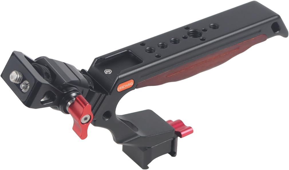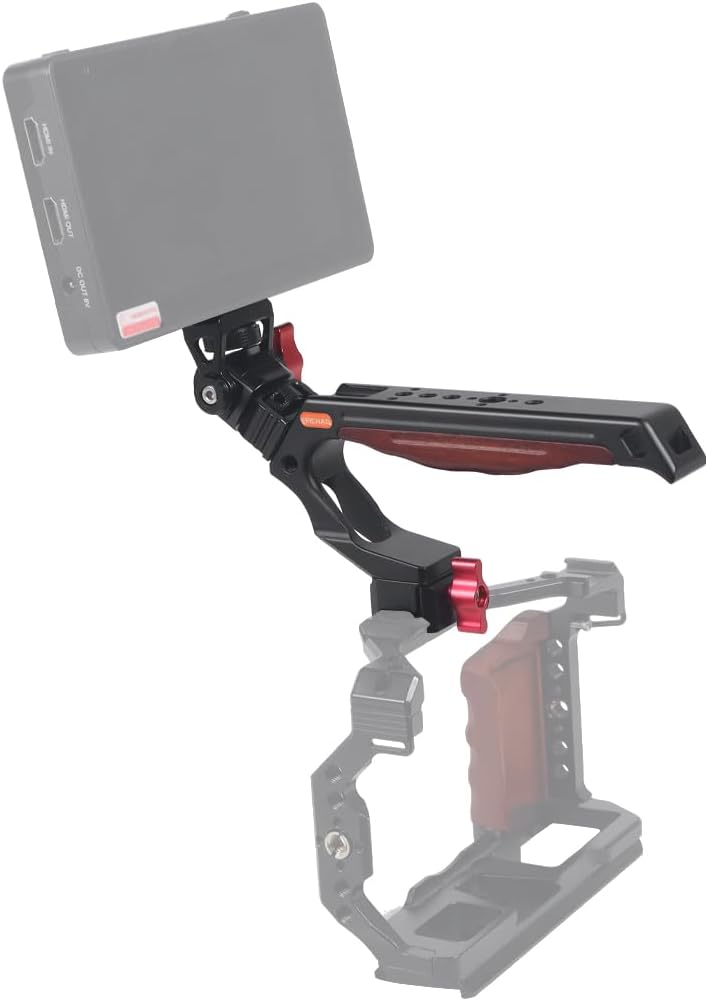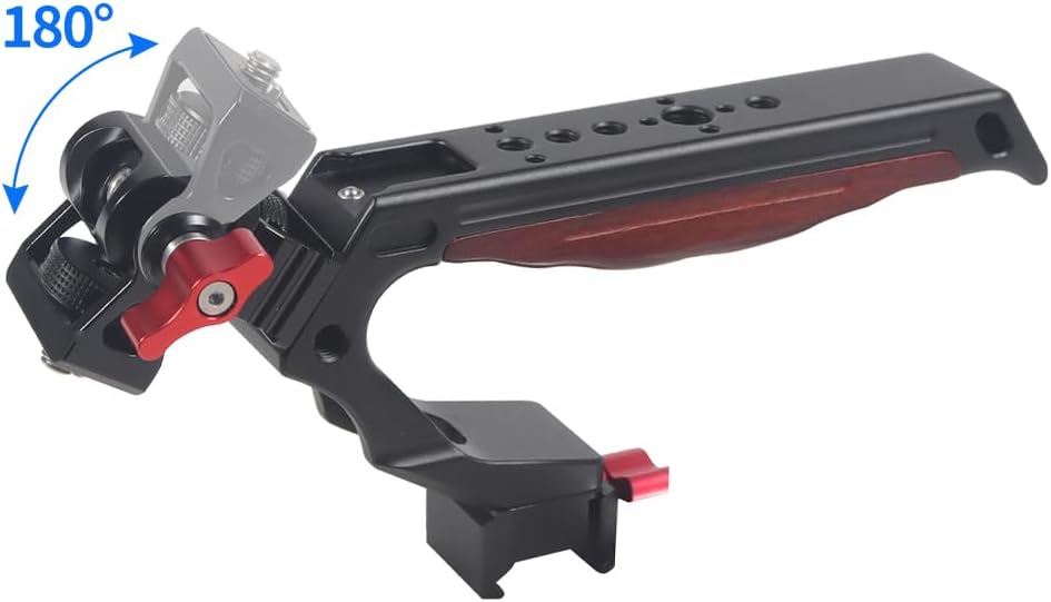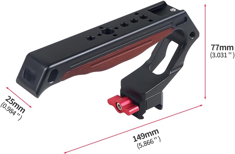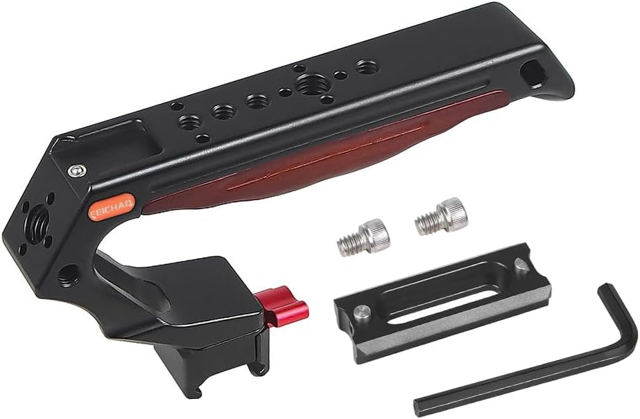 FEICHAO Handle Grip with 3/8" 1/4" Locating Hole Universal Video Rig with Cold Shoe Adapter for DSLR Camera Cage Description Material: Aluminum Alloy + Wooden Aluminum alloy surface technology: Anodic oxidation treatment Functional Use: The cold shoe mount is equipped with anti-drop positioning to prevent loosening. Feature: 1. Wooden grip, comfortable to hold. Tail made with lanyard hole. 2. There are multiple 1/4 screw holes and 3/8 screw holes, multi-functional use. Model Selection: NATO slider Handle: The top handle is designed for quick installation with NATO slider clamping. Positioning Hole Handle: The top carrying handle is designed for 3/8 or 1/4 compatible with Arri positioning mounting.
