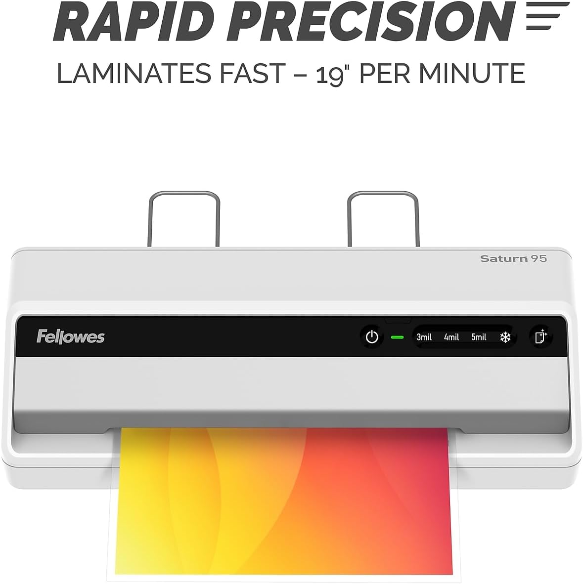 Rapid one-minute warm-up with InstaHeat technology. Accommodates multiple document sizes. Compatible with 3- and 5-mil hot-lamination pouches as well as self-adhesive cold-lamination pouches. Green light and audible beep indicate when machine is ready to laminate. Release lever disengages pouch for re-centering or removal. Auto Shut-Off saves energy and prevents overheating. Includes ImageLast starter kit with ten 3-mil letter-sized pouches.