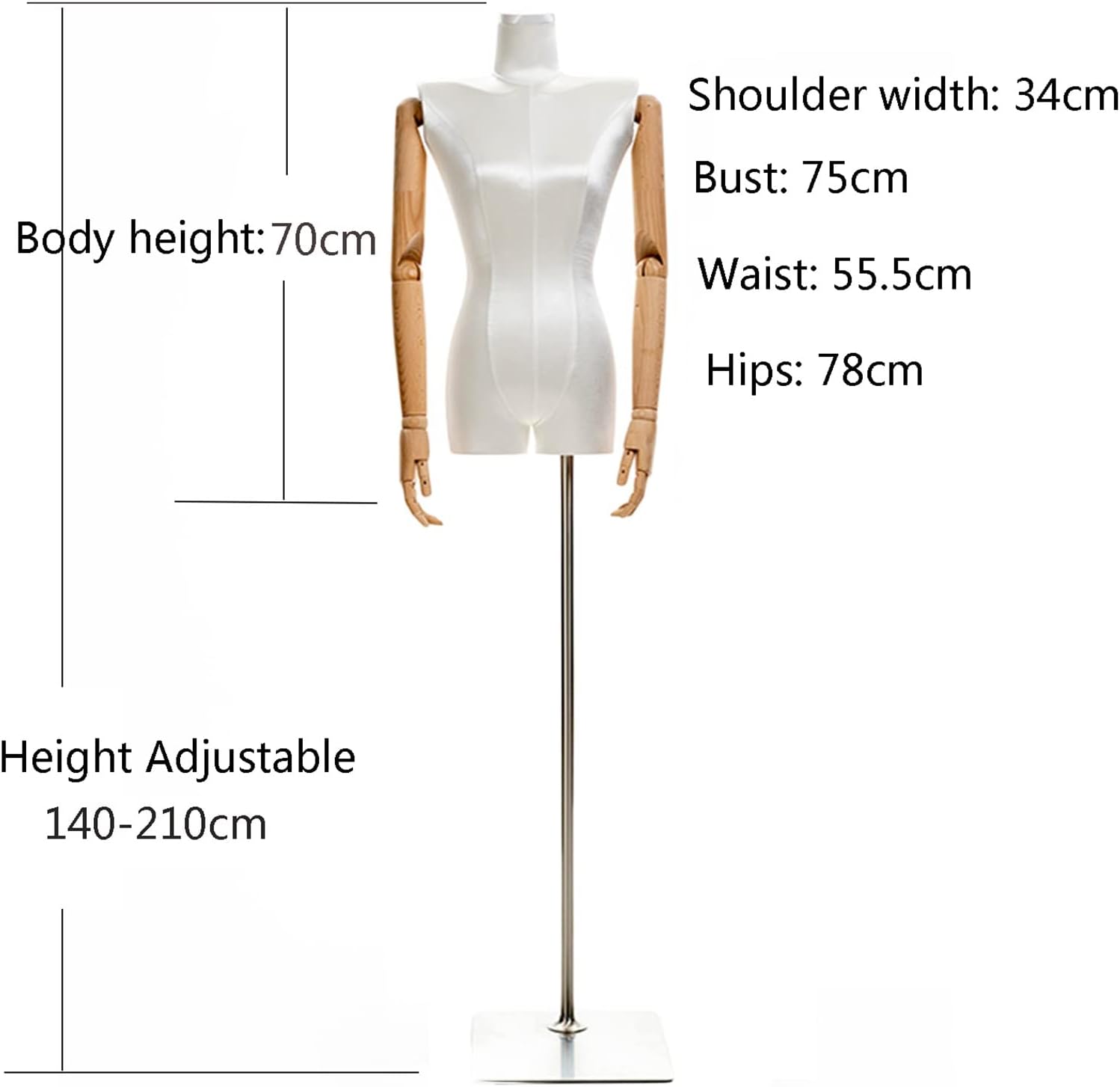 FEATURE 1.ns is very suitable for tailoring, fashion design, shop decoration, home furnishing and handicrafts, and the display in the shop window is more attractive 2.Detachable design, strong flexibility and wide application range 3.Personalized combination to create your ideal storePRODUCT PARAMETER Name: Female mannequin torso Material: Satin fabric Wrapping + PE body material + metal base Arm material: solid wood 2 Styles Available: A: square base, B: Triangle base Detachable: yes Purpose: Clothing display, Photo shoot, Sewing design Size: 1cm = 0.39inch Full Body Adjust height: A-140-210cm, B-150-220cm Shoulder: 34cm Bust: 75cm Waist: 55.5cm Hip: 78cm Body Height: 70cmPRODUCT PACKAGING 1×female mannequin torso 1× metal base 2× solid wood arm SERVICE: 1. Due to manual measurement, please allow 1-2cm errors 2. We also have a variety of styles for you to choose