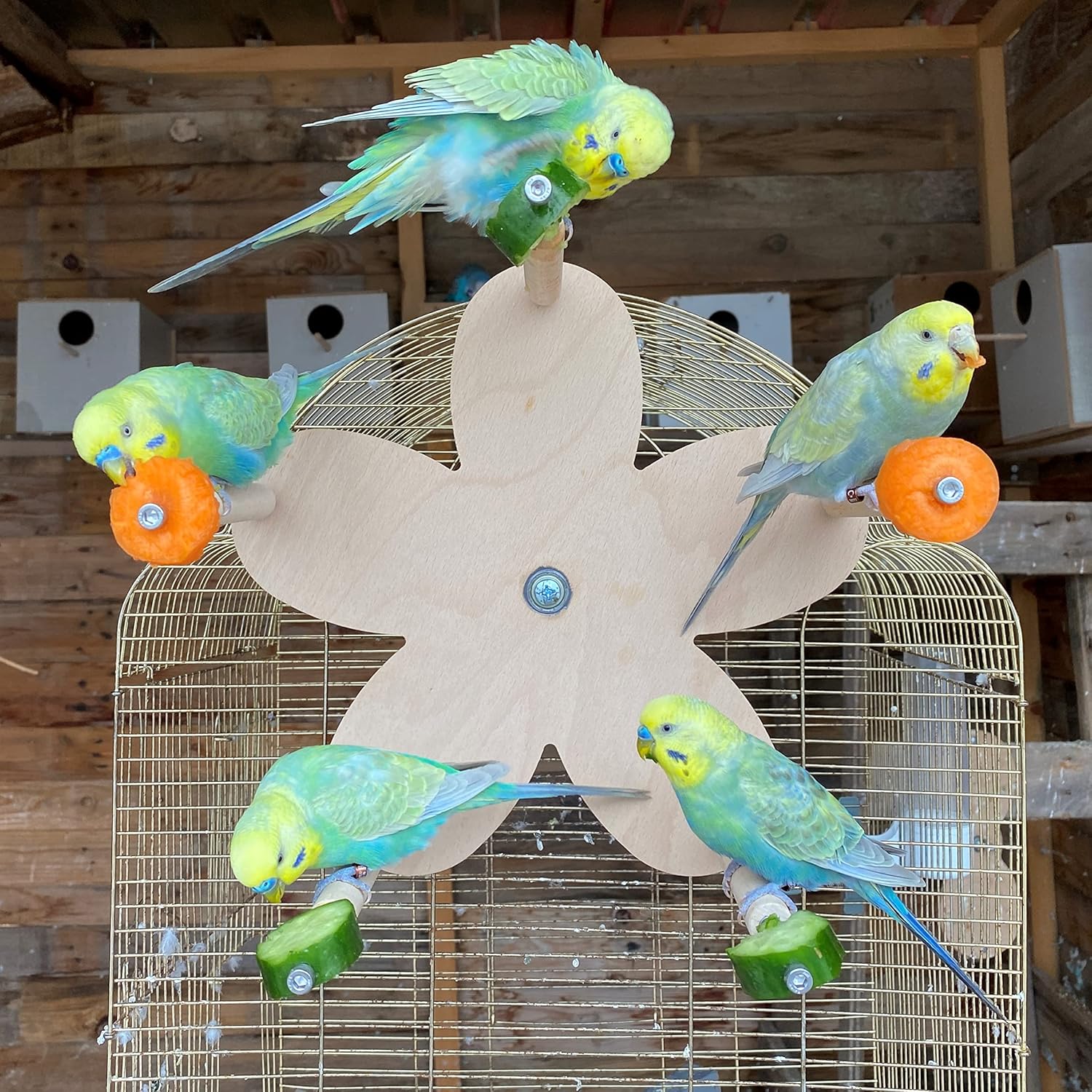 ✔ Rotating bird flower ferris wheel with food holder is a great boredom breaker toy for birds. Your bird will has an excellent time. If you have more than one bird, the fun will increase even more.✔ This wheel toy is only appropriate for small and medium birds such as; Budgie, Budgerigar, Parakeet, Parrot, Canary, Cockatiel, Parrotlet, Lovebird, Ringneck, Conure, Caique, Lorikeet, Forpus, Quaker, Rosella, Lory, Finch, Pionus, Redrump, Kakariki, avians and all aviaries.✔ As your birds swing and spin on the flower wheel toy, they can also taste different foods in the food holders.✔ Your birds may be shy and afraid of the flower wheel toy at first. But food holders will help your birds get used to the wheel toy quickly. You can place your bird’s favorite vegetables and fruits on the stainless steel food holder bolts.✔ You can easily fix the toy inside or outside the bird cage with two washers and a butterfly nut. The fixing washers have large diameter, so you can fix the wheel toy on any bird cages easily.✔ The diameter of the flower wheel is 29 cm (11.41 in). There are 5 perches on the wheel. The perches are approximately 10 cm (3.93 in) long and 16mm (0.62 in) in diameter. Perfect sizes for small and medium birds.✔ Perches are made of beech wood. The bolts holding the food are stainless steel.✔ We can engrave your bird’s name on the wheel by using laser engraving machine. If you want, please specify in the personalization section.✔ Please feel free to ask any question.