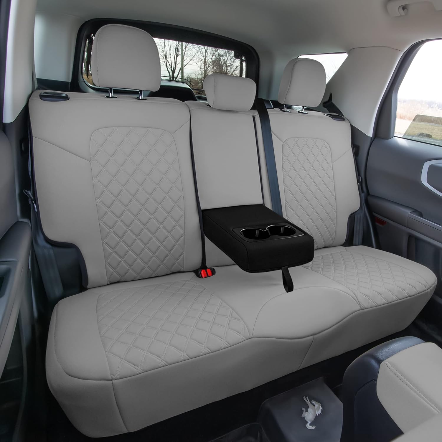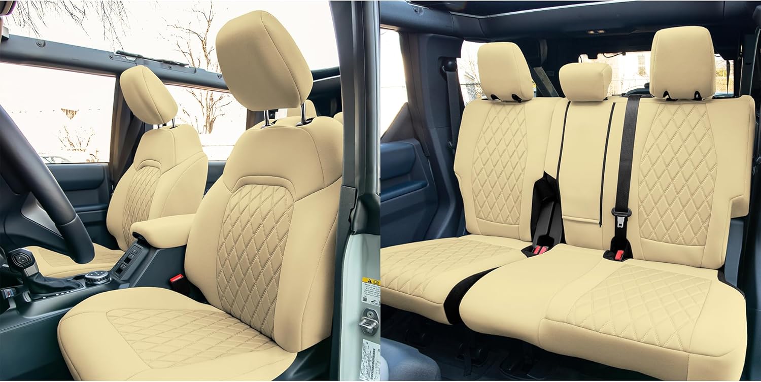 The Ford Bronco Full Size SUV is a massively beautiful vehicle with a sleek design. Something this nice definitely needs to be protected from the inside. Our custom fit seat covers are specifically designed to help protect your vehicle’s interior upholstery, especially when you’re enjoying the removable top feature. Our water resistant neoprene and neosupreme fabrics are engineered to combat any messes that come your way. In addition, the innovative designs allow for the use of all your seat controls and we offer additional storage with slip pockets at the back of your bucket seats. You’ll even have full access to the center consoles, allowing your passengers to enjoy those cupholders in style. Plus, the front has a bonus center console cover for added comfort.