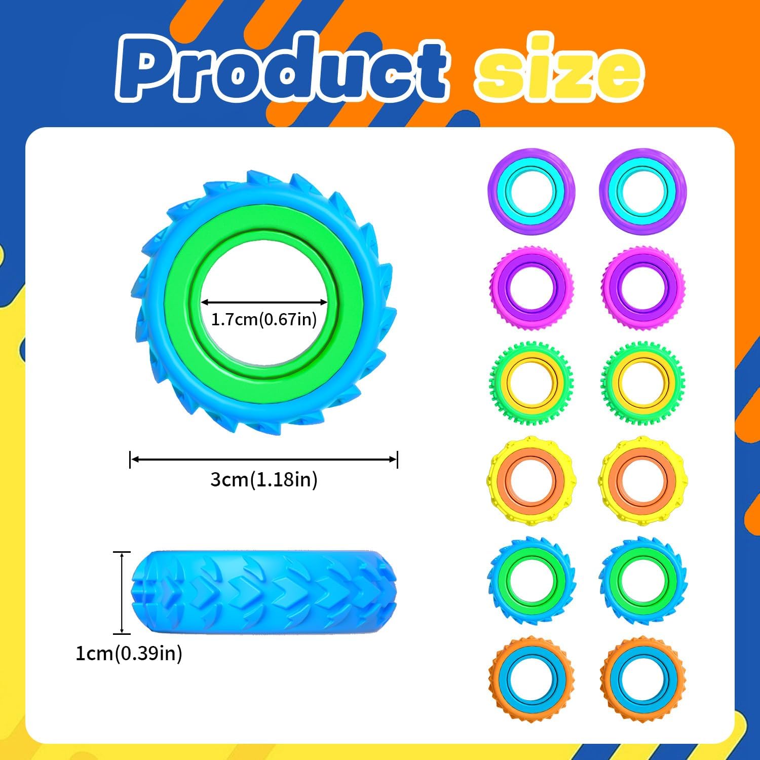 Find Your Calm, Anytime, Anywhere. Discover the simple, effective way to manage daily stress with our Fidget Rings. Crafted from soft, durable silicone, each ring features a smooth, textured surface and a spinning outer band designed to keep restless hands busy and minds focused. Whether you're dealing with workplace anxiety, helping a child with ADHD concentrate, or seeking a quiet sensory tool for autism, these rings offer a discreet and stylish solution. More Than Just a Toy – A Sensory Essential. Our 12-pack provides a versatile toolkit for various needs. The gentle tactile input helps redirect nervous energy, reduce fidgeting, and promote a sense of calm. Perfect for: Classroom Prizes & Treasure Boxes: Teachers love them as quiet, non-distracting rewards that help students focus. Party Favors & Goodie Bags: A unique and useful favor for birthday parties, Easter egg hunts, and holiday celebrations. Therapy & Calming Corners: An essential tool for occupational therapists, counselors, and parents to support emotional regulation. Adults at Work: A desk-friendly gadget to relieve stress during long meetings or intense work sessions. Designed for Comfort and Durability. Made from high-quality, hypoallergenic silicone, these stretchy rings are comfortable to wear all day and fit most finger sizes (approx.1.7cm inner diameter). The smooth, silent rotation ensures you can fidget without disturbing others. Lightweight and portable, you can easily clip them to a backpack or keep one in your pocket for instant stress relief whenever you need it.