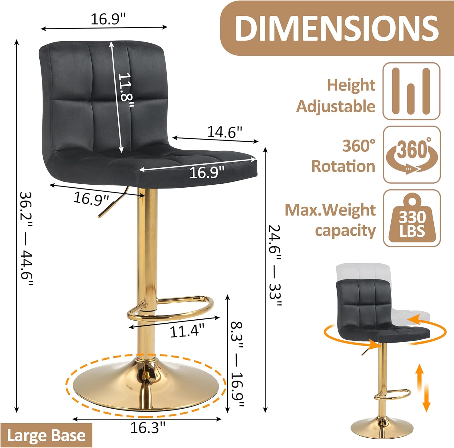 • 【Long-Lasting Design】Crafted with a metal frame, foam padding, and covered in Velvet Fabric, our barstools ensure sturdiness and easy maintenance. With a weight capacity of 330 pounds, the swivel stools are both robust and long-lasting. The large base with a rubber ring prevents skidding and protects your floor from scratches.