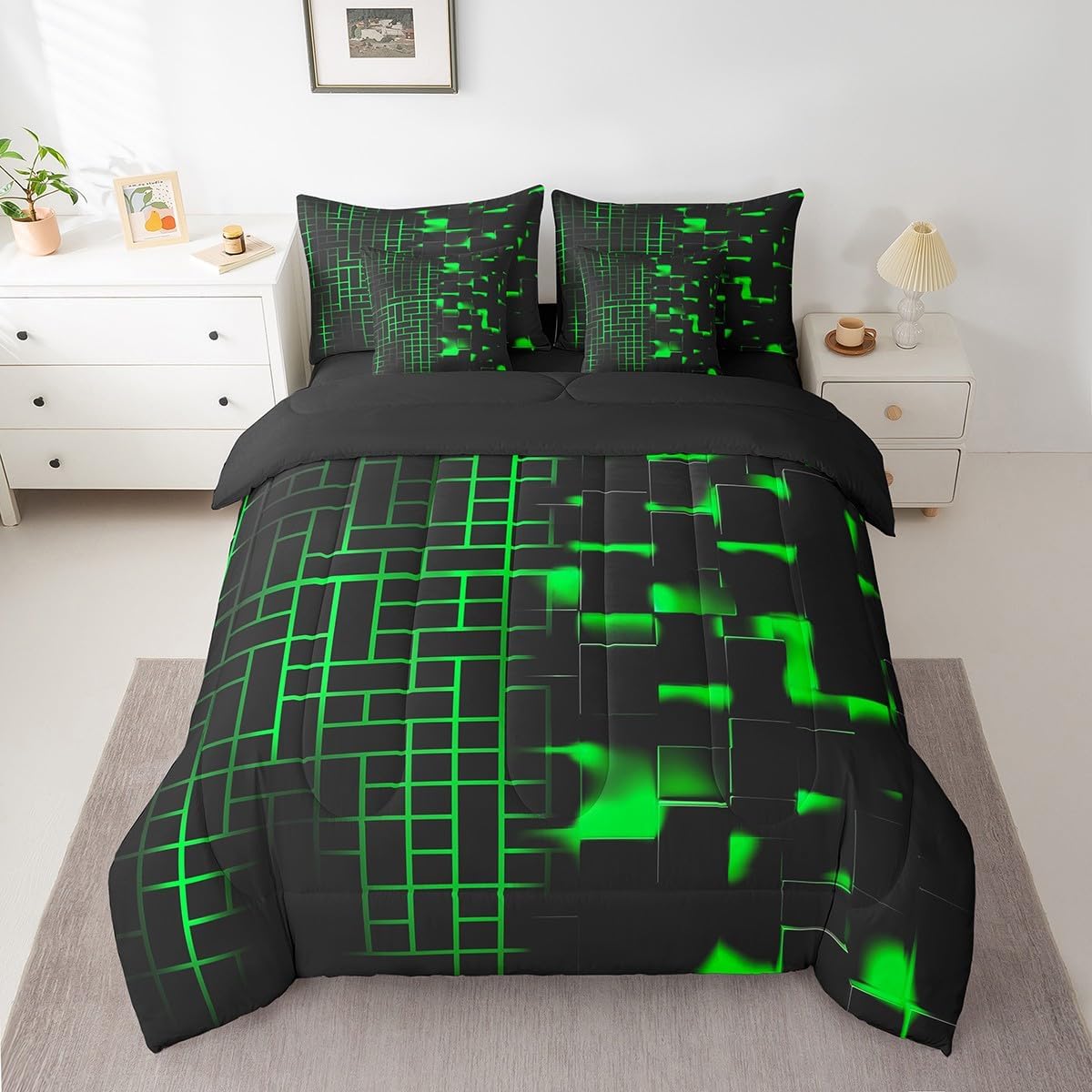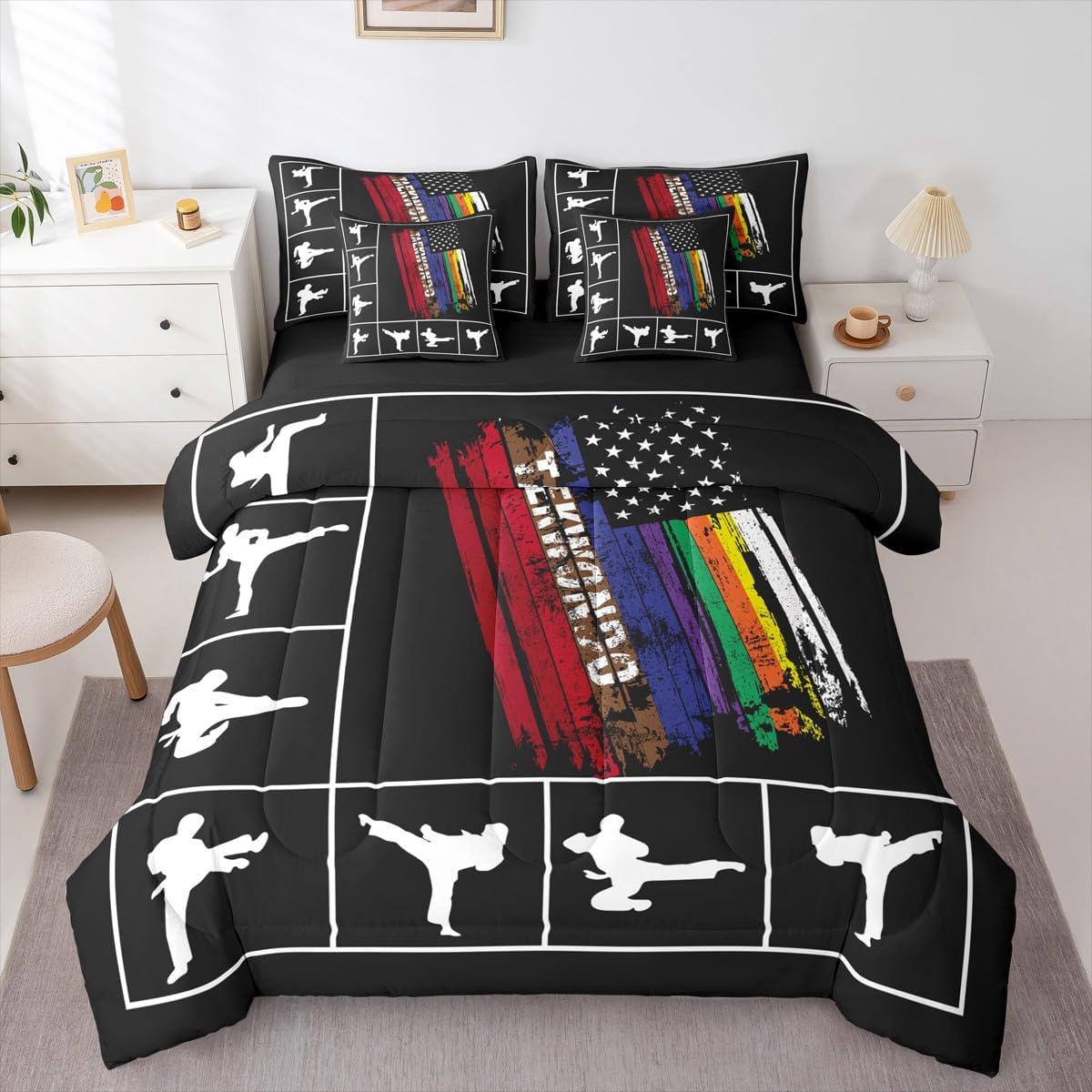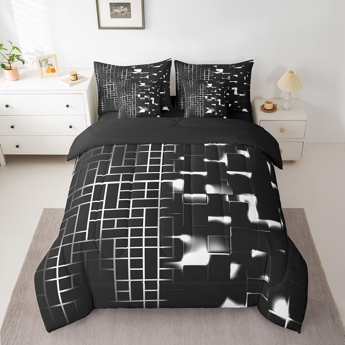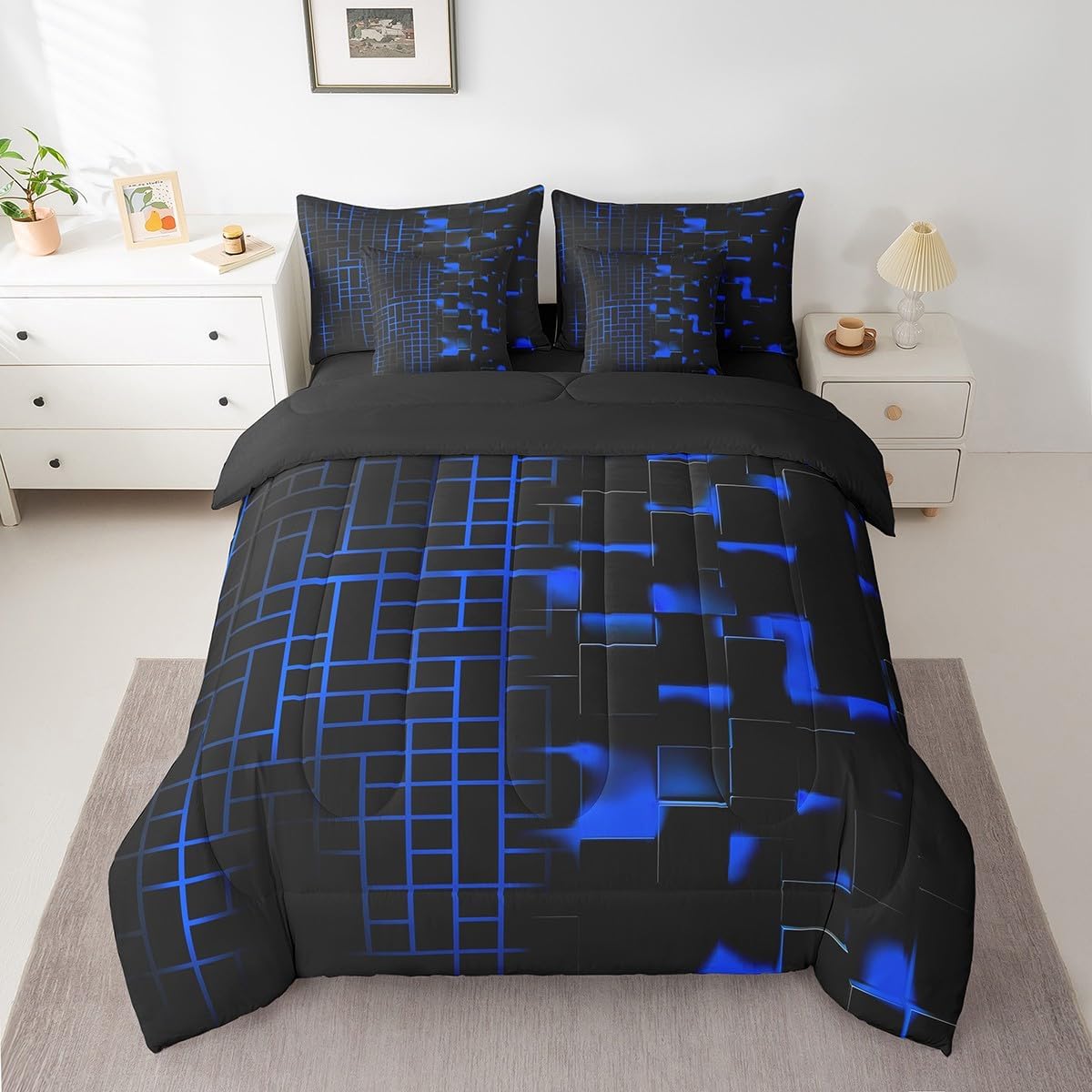 Welcome to our store. Size information: Twin size: 1 Comforter 68"W x 90"L and 1 Fitted Sheet 39"W x 75"L x 16"H and 1 Flat Sheet 67"W x 96"L and 2 Pillowcases 20" x 30" and 2 Throw Pillow Covers 18" x 18" . Full size: 1 Comforter 79"W x 90"L and 1 Fitted Sheet 55"W x 75"L x 16"H and 1 Flat Sheet 81"W x 96"L and 2 Pillowcases 20" x 30" and 2 Throw Pillow Covers 18" x 18" . Queen size: 1 Comforter 90"W x 90"L and 1 Fitted Sheet 60"W x 80"L x 16"H and 1 Flat Sheet 90"W x 102"L and 2 Pillowcases 20" x 30" and 2 Throw Pillow Covers 18" x 18" . King size: 1 Comforter 104"W x 90"L and 1 Fitted Sheet 78"W x 80"L x 16"H and 1 Flat Sheet 90"W x 106"L and 2 Pillowcases 20" x 36" and 2 Throw Pillow Covers 18" x 18" . Useful and practical: A luxurious product for homes,dorm rooms,hotels,guest rooms.Practical to use for being polyester, feels like cotton which is super soft and breathable.No chemicals used, no dye substance harming the health of you or your family. Unique design: Vivid Colors won't fade thanks to new 3d digital printing methods. These unique designs match well with various color palettes of your rugs, curtains, headboard, furniture, and all other decor accessories. Washing instructions: Machine wash it in cold water without bleach,and tumble dry on low heat to restore its freshness and appearance.