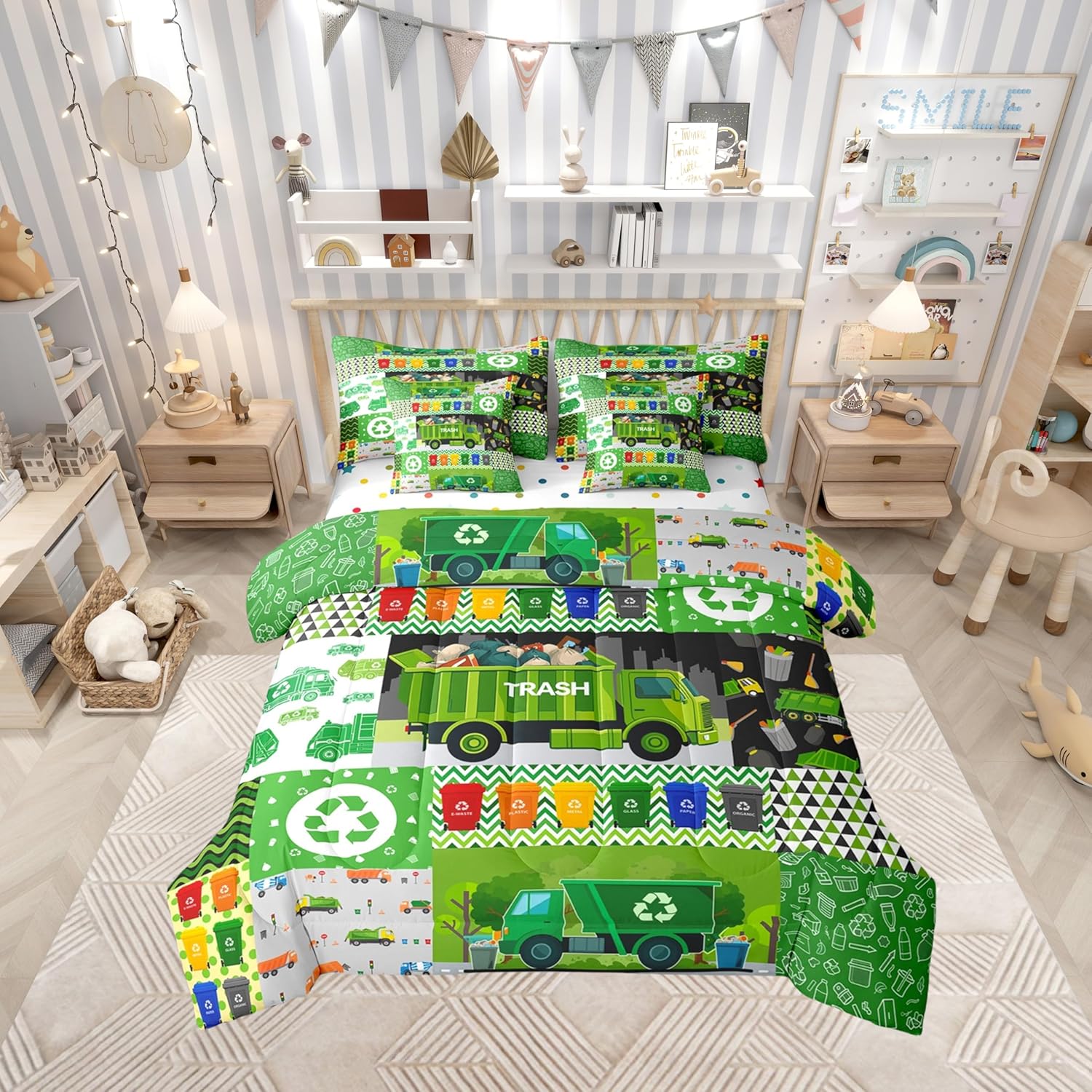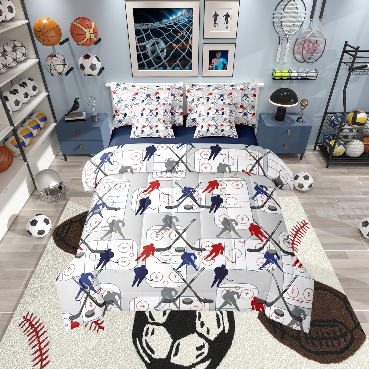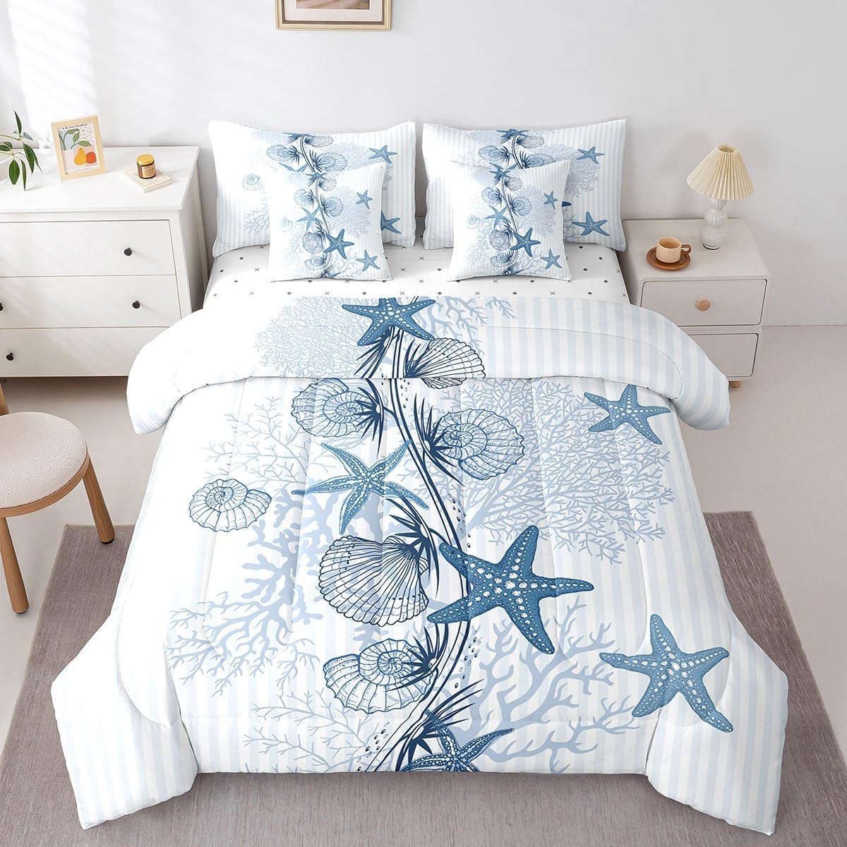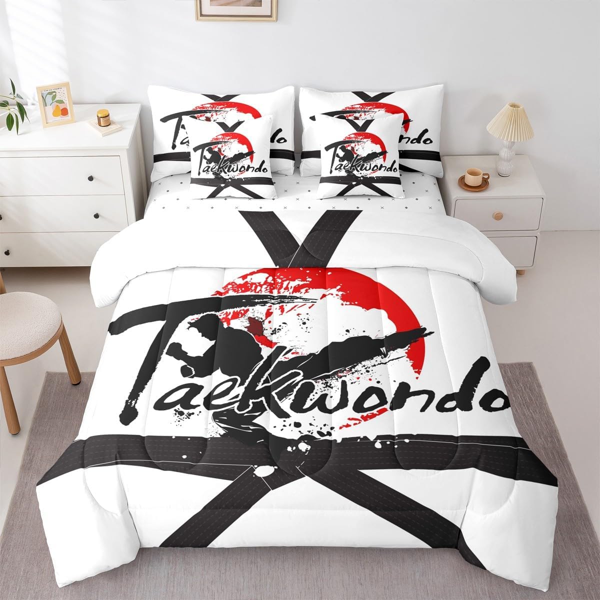 Welcome to our store. Size information: Twin size: 1 Comforter 68"W x 90"L and 1 Fitted Sheet 39"W x 75"L x 16"H and 1 Flat Sheet 67"W x 96"L and 2 Pillowcases 20" x 30" and 2 Throw Pillow Covers 18" x 18" . Full size: 1 Comforter 79"W x 90"L and 1 Fitted Sheet 55"W x 75"L x 16"H and 1 Flat Sheet 81"W x 96"L and 2 Pillowcases 20" x 30" and 2 Throw Pillow Covers 18" x 18" . Queen size: 1 Comforter 90"W x 90"L and 1 Fitted Sheet 60"W x 80"L x 16"H and 1 Flat Sheet 90"W x 102"L and 2 Pillowcases 20" x 30" and 2 Throw Pillow Covers 18" x 18" . King size: 1 Comforter 104"W x 90"L and 1 Fitted Sheet 78"W x 80"L x 16"H and 1 Flat Sheet 90"W x 106"L and 2 Pillowcases 20" x 36" and 2 Throw Pillow Covers 18" x 18" . Useful and practical: A luxurious product for homes,dorm rooms,hotels,guest rooms.Practical to use for being polyester, feels like cotton which is super soft and breathable.No chemicals used, no dye substance harming the health of you or your family. Unique design: Vivid Colors won't fade thanks to new 3d digital printing methods. These unique designs match well with various color palettes of your rugs, curtains, headboard, furniture, and all other decor accessories. Washing instructions: Machine wash it in cold water without bleach,and tumble dry on low heat to restore its freshness and appearance.