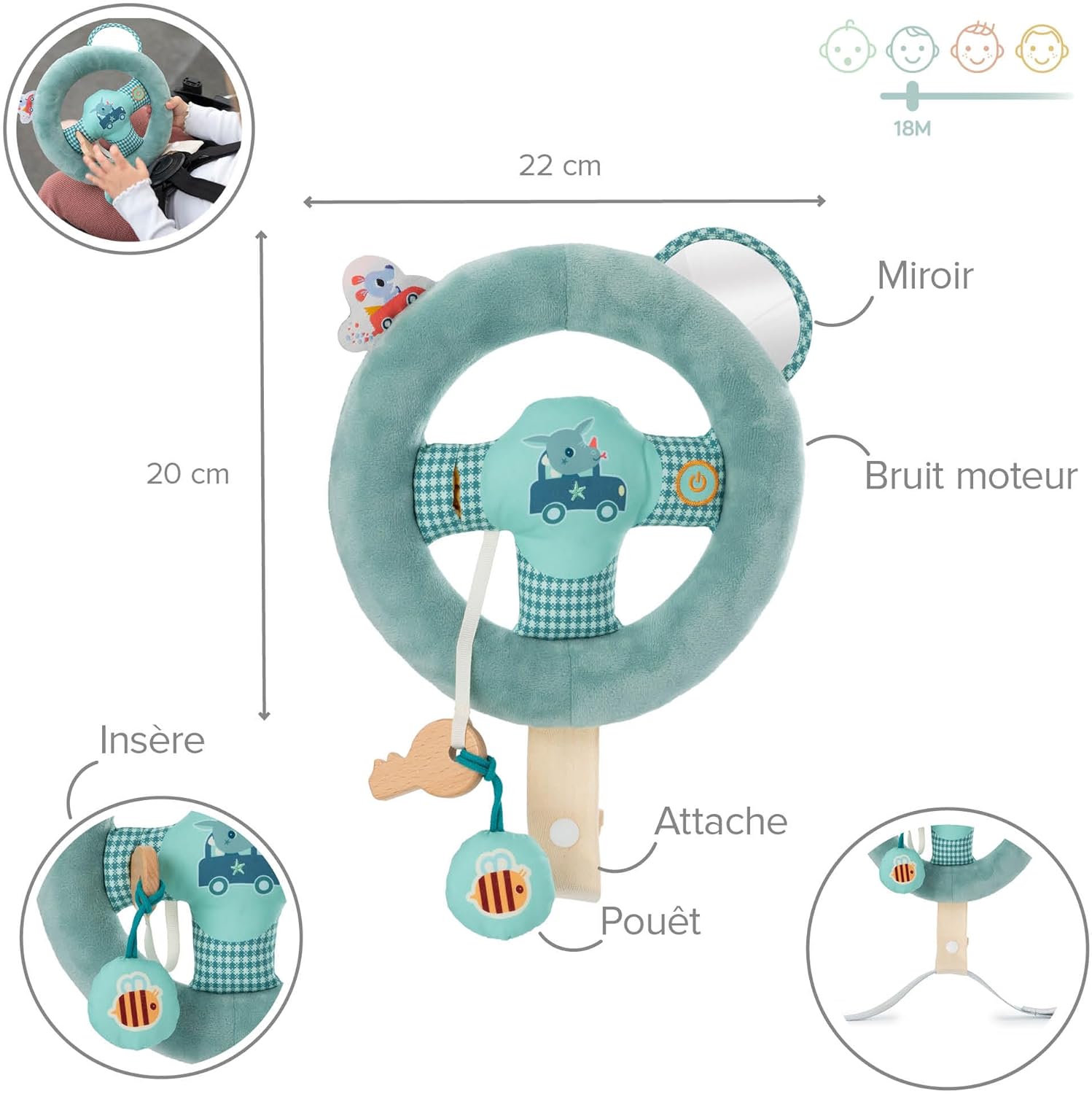 The steering wheel from Lilliputiens. Very soft steering wheel and easy to handle. Looks like a real steering wheel. Stimulates imagination, hand-eye coordination and sensory development. Attaches to car belt Several activities such as a mirror and a key ring pouet and an engine noise. Age: 18 months Dimensions: 22 x 6 x 20 cm Material: polyester and wood