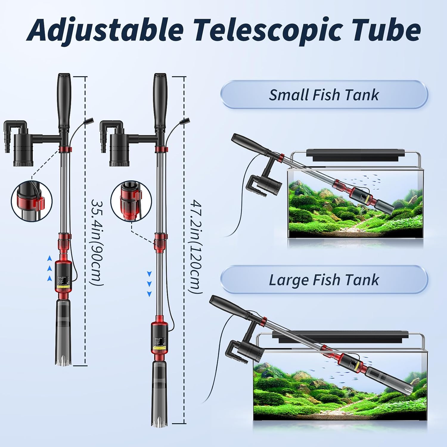 Fish tank cleaner vacuum Our electric aquarium cleaning kit is equipped with a high-efficiency electric motor that easily extracts dirt and debris from the bottom, ensuring clear and transparent aquarium water and creating an ideal environment for your aquarium ecology. The fish tank cleaner with Water Changer + Sand Cleaner + Fish Debris Cleaning + Water Filter + Water Shower + Suction 6 in 1 functions. You can easily clean the fish tank, the aquarium siphon pumps strong suction and large flow, making it easy to clean the dirt from the bottom of your aquarium.