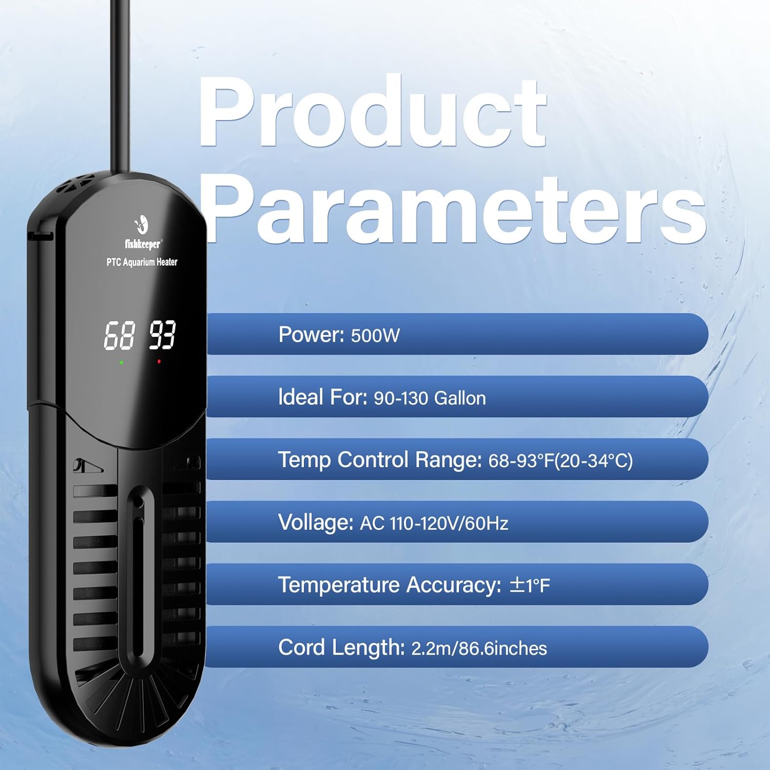 fishkeeper Aquarium Heater, 500W Submersible Fish Tank Heater with Induction Heating (IH) Systems and Temperature Controller for Freshwater Saltwater, LED Display, Explosion (No Glass) for 90-130 Gal