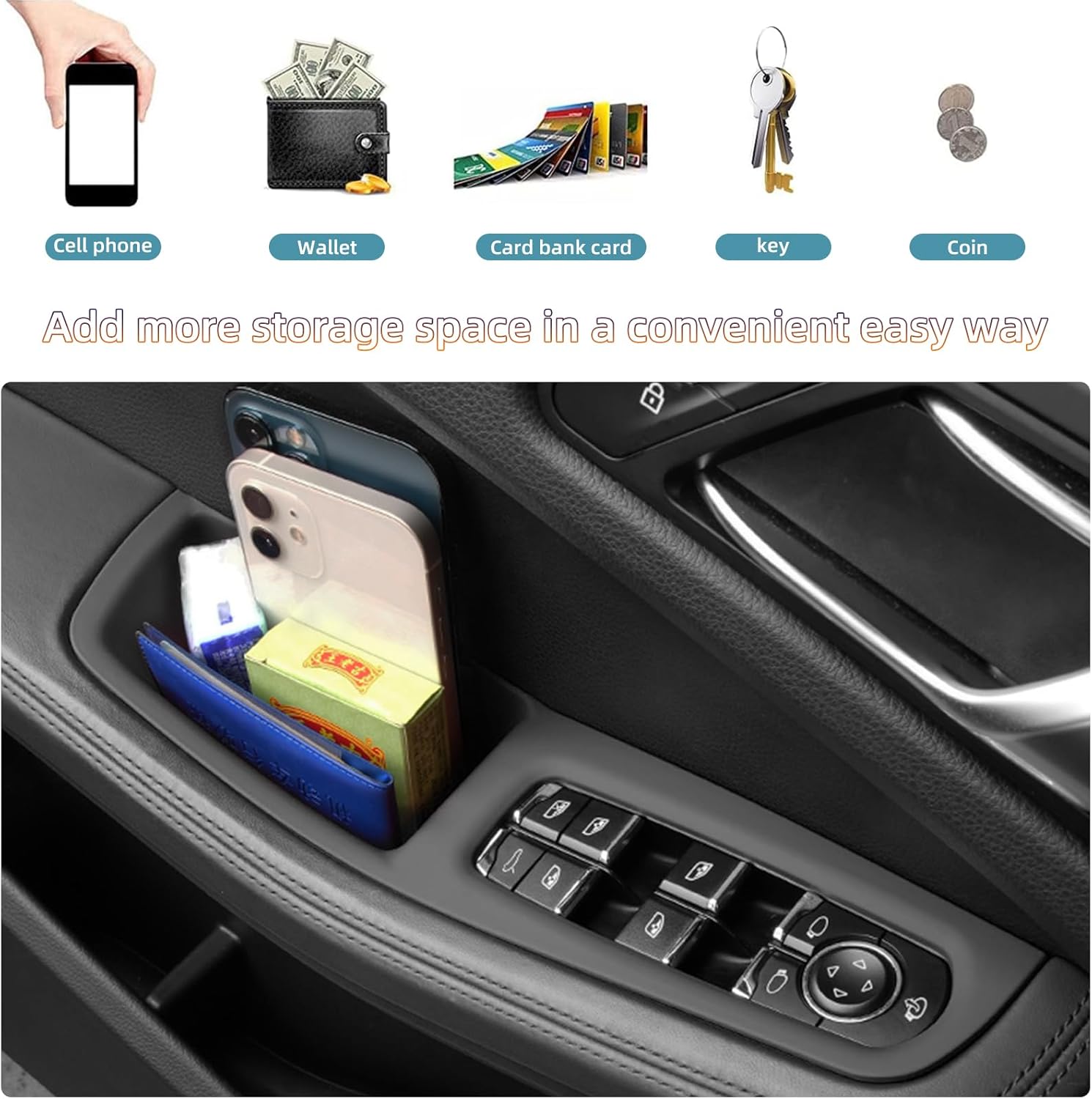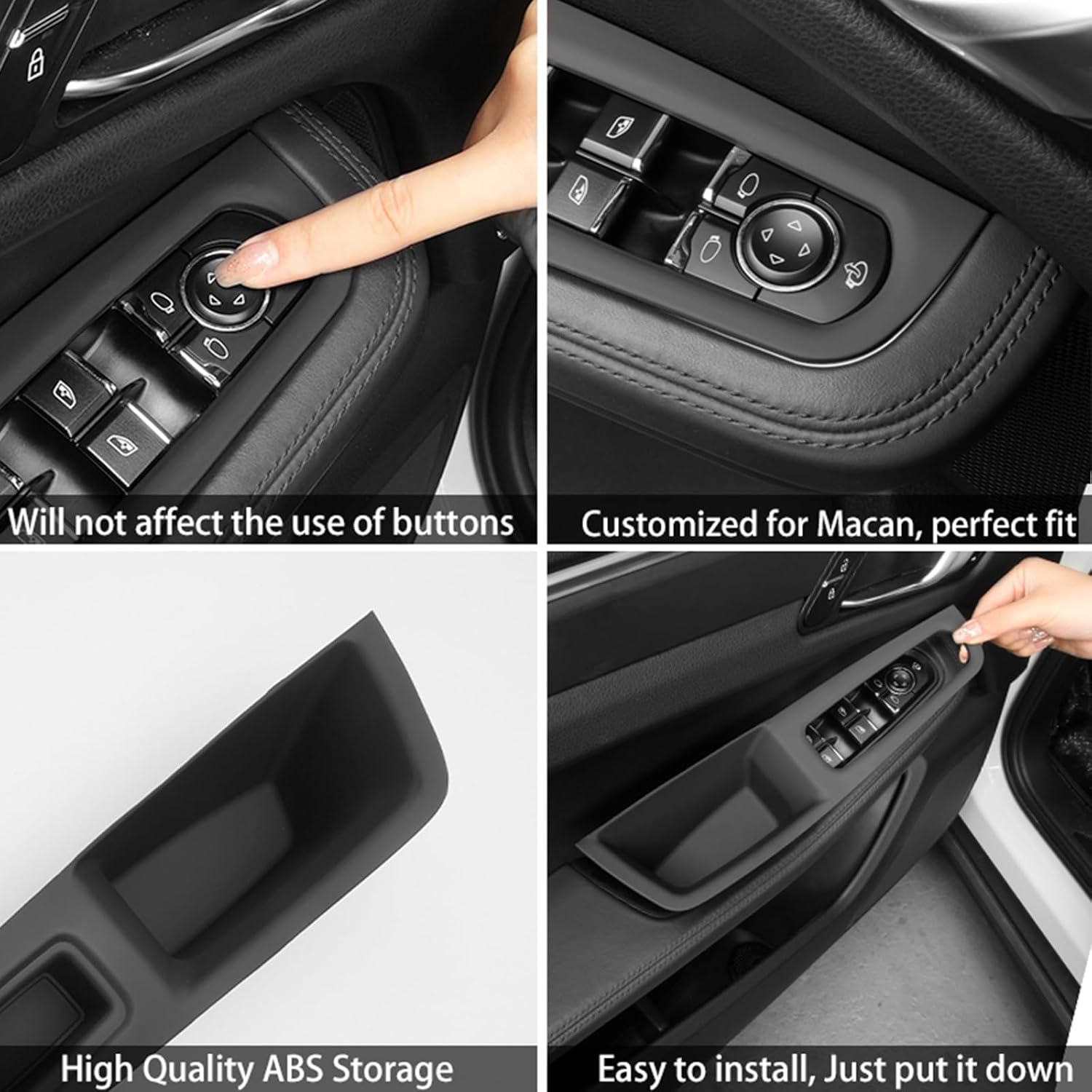【Compatible】Fits for Porsche Macan Accessories, including 2014 2015 2016 2017 2018 2019 2020 2021 2022 2023 2024 2025 2026 models 【Material】ABS Plastic 【Quantity】4pcs/set(2pcs for front doors and 2pcs for rear doors) 【Weight】 270g/set 【Color】 Black or Red 【Features】 a. Add more storage spaces for the porsche macan door side. b. Protect the door handle panel from scratch and dirty. c. Convenient use, do not need to remove original parts, Just put it down and it will tighten. d. Easy to install, directly snap in. e. Perfect match with car interior, the same color as original car interior. f. Designed according to original car data, perfect fit size.
