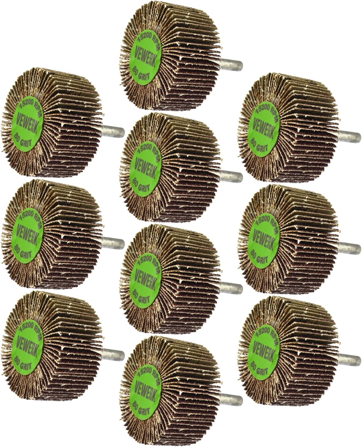 For use in a drill or die grinder for removing paint. Can be used for smoothing and finishing wood. Also suitable for the removal of rust and paint from metal. Can be used for the polishing of metal or for cleaning the surface before buffing. This listing is for 10 flap wheels. Specifics: Wheel Diameter : 50mm. Wheel Length : 25mm. Arbor size : 6mm. Grit : 80. Max RPM : 152000.