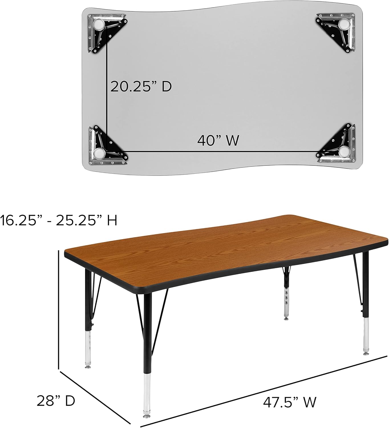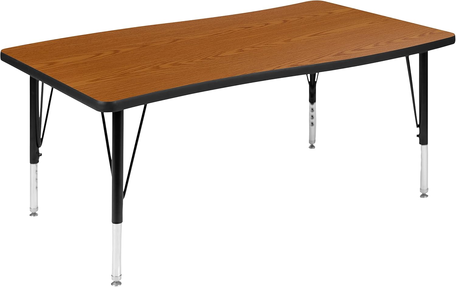 Develop students interpersonal skills with these flexible learning wave activity tables that are shaped for group learning success. Students will have plenty of working space on this 3-piece nesting classroom table with two half circle end pieces and a rectangular middle table. Complete with seating by pairing with our ergonomic shell stack chairs. Built to last through many class turnovers the thermal fused laminate top is scratch, stain and warp resistant. An attractive black powder coated finish protects the upper legs from scratches and height adjustable chrome lower legs give you the flexibility to raise or lower the table a full 9" in 1" increments. Self-leveling nylon floor glides keep the table from wobbling and protect your floor by sliding smoothly when you need to move it. Students of the 21st century will look forward to learning on modern classroom tables, do not allow your classroom setting to fall behind. Create unlimited combinations using various shaped nesting activity tables in your classroom, lab, or library.