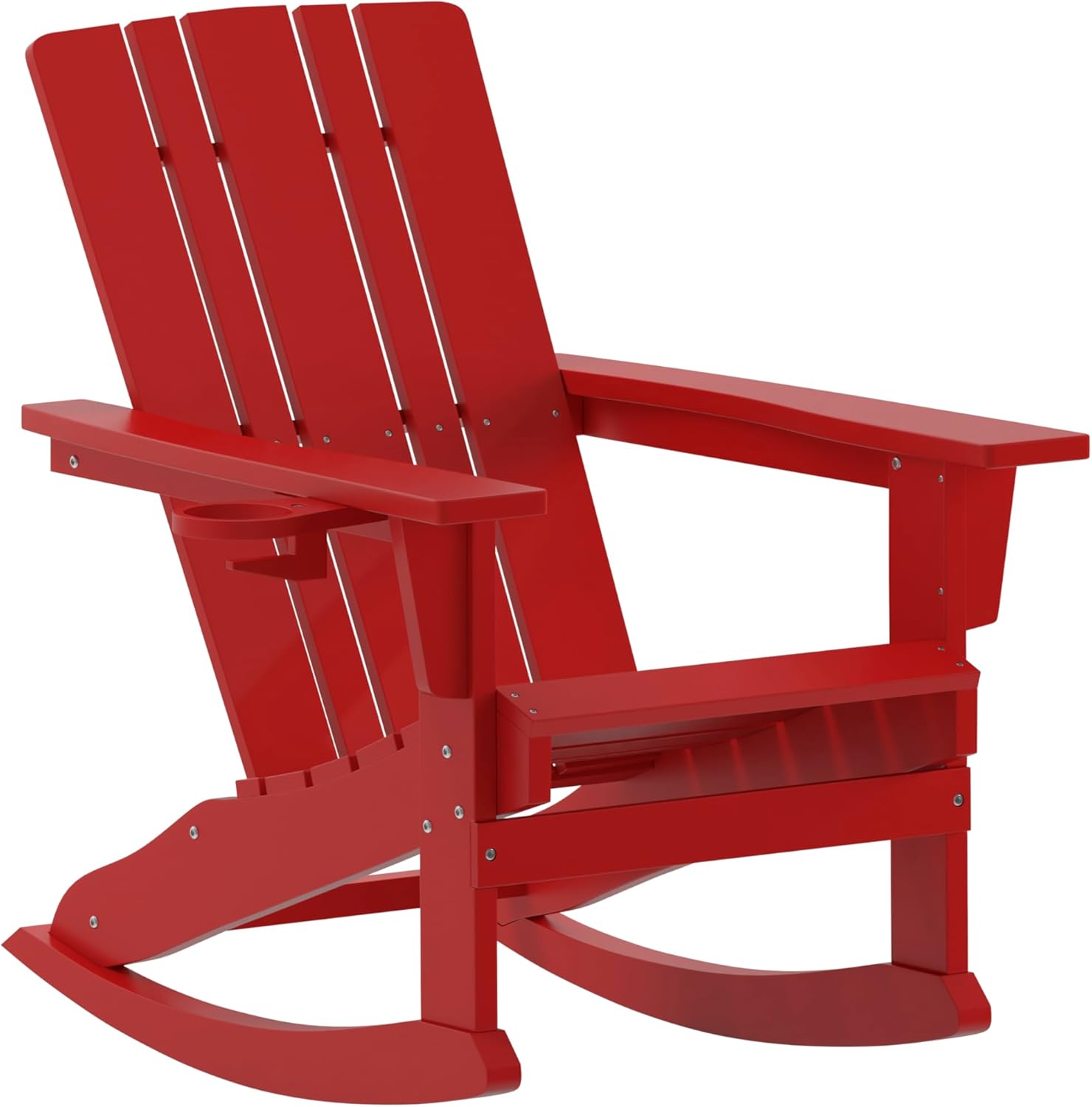 Provide the perfect place for patrons and guests or friends and family to relax and unwind at your home or business in total comfort with this all-weather adirondack style rocking chair. No matter your decorating style, the vertical slat back and sloped seat design add a new twist to a classic favorite that fits in anywhere. The extra wide arms will help relieve tension from the neck and shoulders while the sloping runners provide smooth rocking motion for cozy relaxation. This indoor/outdoor rocking chair is made of long-lasting HDPE so there is no warping, rotting or chipping and no back breaking sanding and staining necessary to keep this chair looking great. Stronger than wood, this outdoor rocking chair will hold up to 300 pounds static weight capacity and ensure you have a comfortable, worry free seating experience. This porch rocking chair is weather and rust resistant to stand up to all elements from blistering summers to snowy winters and everything in between. Assembly is quick and easy and the tools are included so you can make use of your new rocker chair in 30 minutes or less. Take care of pesky dirt or spills with a damp cloth. Buy a pair of these rocking chairs to form a cozy conversation area or pair several with one of our outdoor patio heaters for the complete year-round setup.