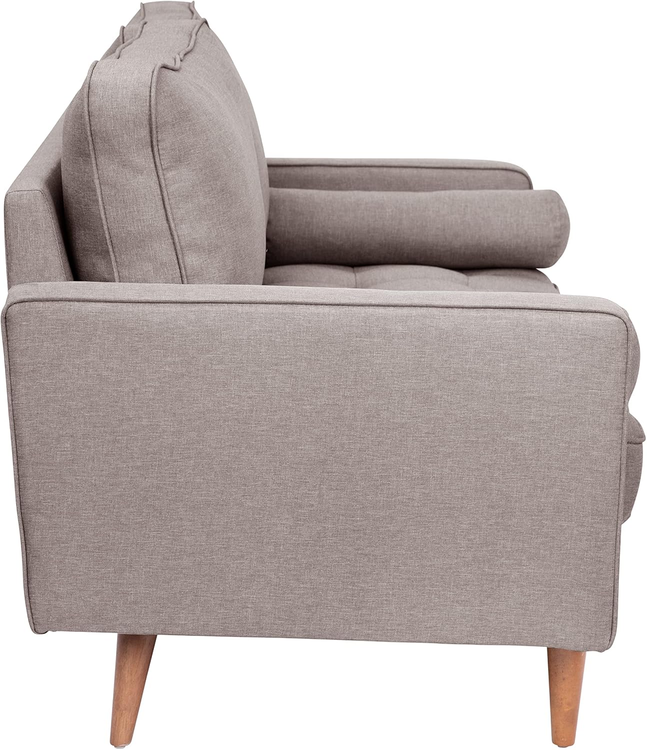Refresh the look of your current home or furnish your new residence with the trendy mid-century modern aesthetic of this compact loveseat ideal for small spaces. Upholstered in commercial grade faux linen fabric and boasting buttonless tufting on the seat cushion, this 2-seater sofa, with included bolster pillows, lends a chic, updated look to any space. Durability is just as important as great looks and this modern loveseat has plenty of both. Real wood legs and a solid wood frame allow this loveseat to hold up to 600 Lbs. static weight while generous foam padding paired with pocket springs adds an extra supportive feel. Fixed floor glides prevent damage to your hard flooring surfaces and the attached seat cushion keeps your space tidy but the back cushions can be removed for a quick catnap. Assemble your new settee in less than 10 minutes with no tools required and easily keep it looking new by cleaning with a damp cloth. This 2 person couch arrives in a single box and pairs with other pieces in our collection giving your room a sophisticated, cohesive look.