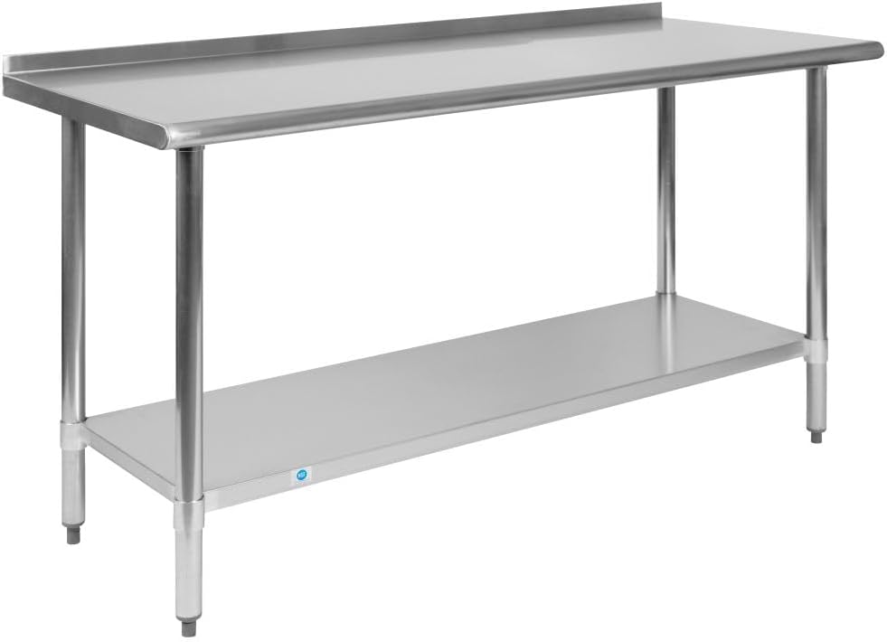 Maximize your busy work space with the Flash Furniture Reader Prep and Work Table. This heavy-duty kitchen prep table provides an efficient work surface for food prepping, storage, or display in kitchens, bistros, cafeterias, and bars, offering much needed additional space that increases functionality in busy restaurants. Constructed from corrosion-resistant, 18-gauge stainless steel, this high-quality metal utility table withstands years of heavy-duty, high-volume use in kitchens and is certified to NSF quality standards to reduce the chance of foodborne illness. It holds up to 600 pounds of static weight to accommodate stand mixers, microwaves, or bread machines, and the adjustable undershelf holds up to 200 pounds of static weight to offer storage for utensil holders, condiments, and canned goods. The clean lines and rounded corners help to alleviate staff injuries, and the 1" adjustable, non-marring feet prevent the table from wobbling on uneven floors. In addition to kitchen use, this versatile commercial work table can also be used as a planting station, a work surface in your garage, a freestanding island in laboratories and veterinary clinics, and much more. This workstation table measures 72" W x 30" D x 34.5" H with a 65.125" W x 22" D x 4-28" H undershelf.